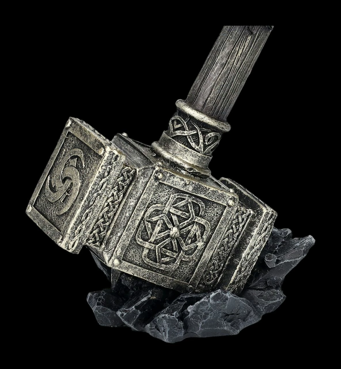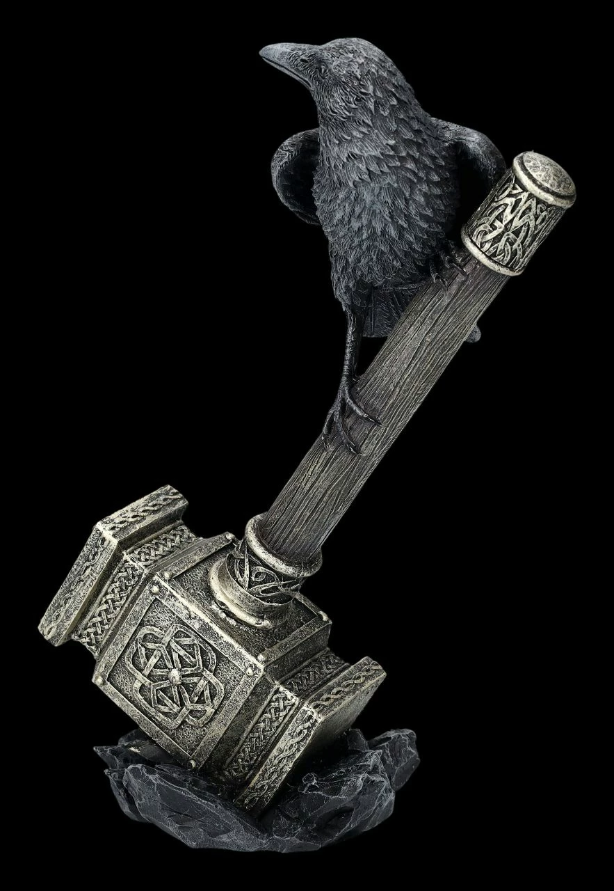 Ein Rabe hat sich auf Thors Hammer Mjölnir niedergelassen und scheint darauf zu warten, dass Thor persönlich kommt, um den Hammer an sich zu nehmen. Schließlich ist nur Thor so stark, den magischen Hammer aufzuheben. Mit diesem Kriegshammer soll er als der stärkste aller Götter deren Feinde und vor allem auch die Midgardschlange bekämpfen. Dieser 23 cm hohe, 15,5 cm breite und 9 cm tiefe Hammer mit dem Raben wurde sorgfältig und detailreich aus handbemaltem Kunststein (Polyresin) gefertigt. Er ist eine prächtige Deko und darf bei keinem Wikinger fehlen. Für jeden echten Wikinger ist Thors Hammer mit dem Raben aber auch ein fantastisches Geschenk.