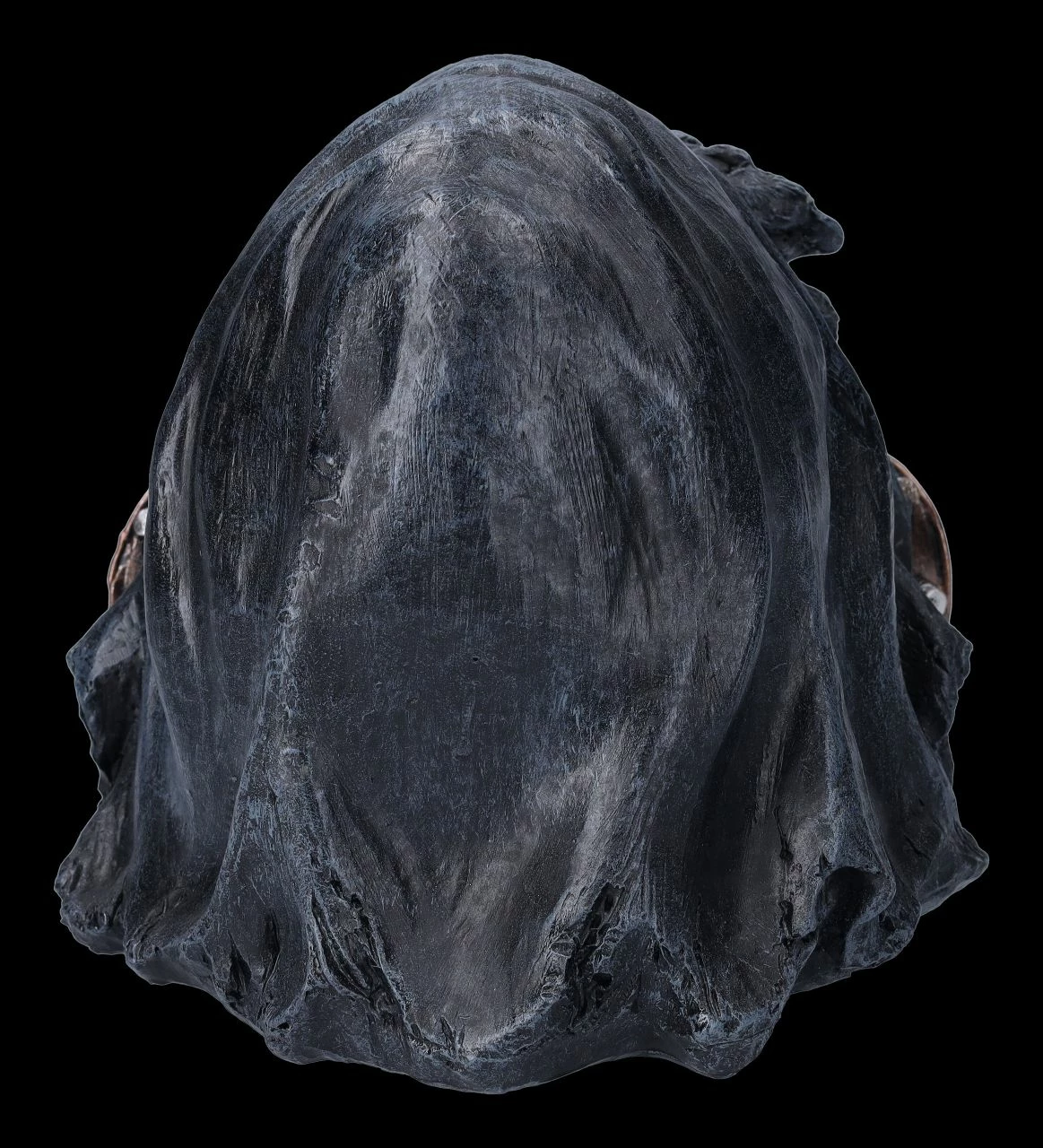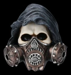 Damit er nicht jedem seinen Pesthauch ins Gesicht bläst, wurde er mit einer stabilen Gasmaske ausgestattet – der Reaper Totenschädel mit der schwarzen Kapuze. Catch Your Breath wäre manchmal nicht nur für den Reaper hilfreich. Der witzige, 17 cm hohe, 16 cm breite und 19 cm tiefe Reaper Totenkopf wurde bis zu den technischen Details der Gasmaske aus Kunststein (Polyresin) gefertigt und sorgsam handbemalt. Er ist ein – vielsagender – Blickfang auf jedem Schreibtisch.