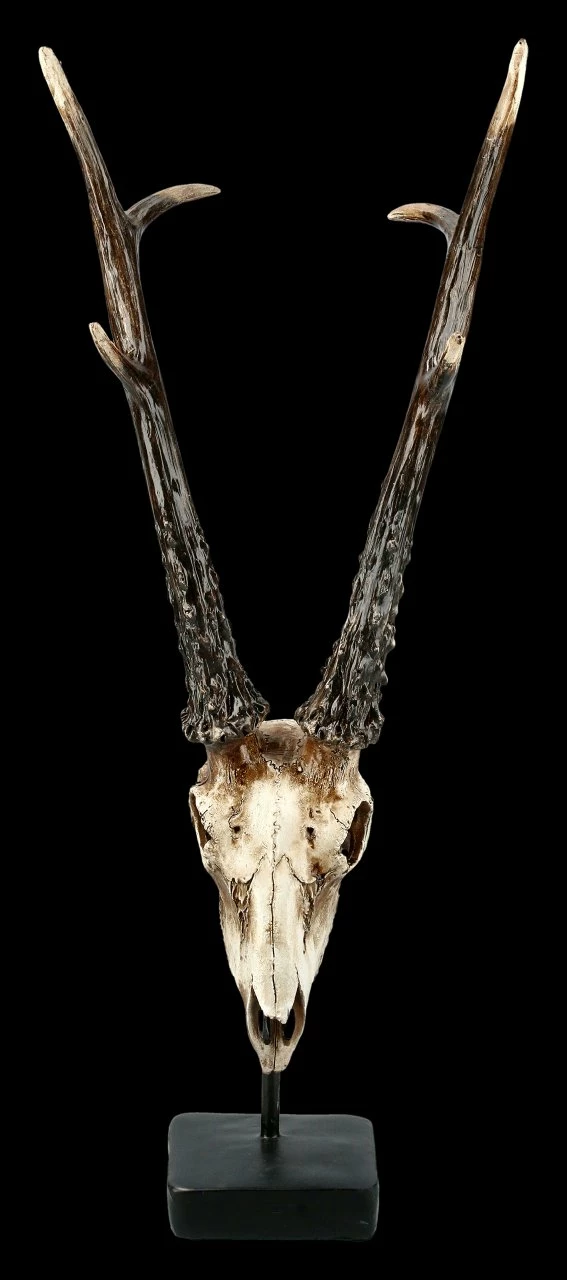 Ob im Wohnbereich oder in Ihrem Arbeitsbereich, dieser ungewöhnlich dekorative Totenkopf eines Rehbocks mit den langen Hörnern wird überall mit Sicherheit alle Blicke auf sich ziehen. Der schön geformte Rehbock-Schädel ist sehr aufwändig und detailreich aus Kunststein (Polyresin) gefertigt und mit großer Sorgfalt handbemalt. Der Schädel ist auf einem Metallständer befestigt und wirkt durch seine elegante, schmale Silhouette beeindruckend effektvoll. Mit seiner Gesamthöhe von 51 cm, wobei der Schädel eine Höhe von 44 cm hat, der Breite von 20 cm und der Tiefe von 11 cm ist dieser Rehbock-Schädel mit den langen Hörnern eine wirklich außergewöhnliche Dekoration.
