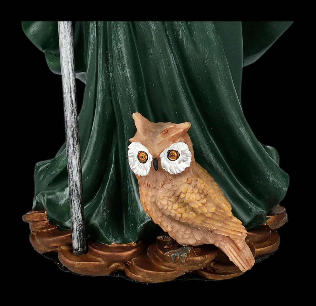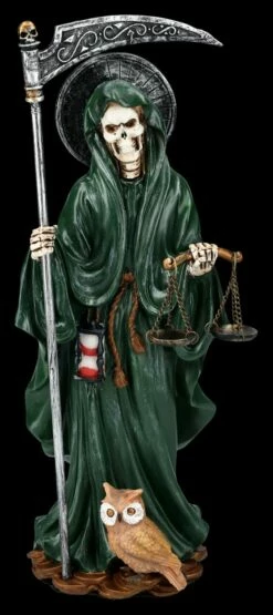 Der Sensenmann im grünen Umhang trägt einen Heiligenschein. In der rechten Hand hält er aufrecht seine verzierte Sense und in der linken Hand hält er eine Waage, mit der er zeigt, dass seine Entscheidungen gut ausgewogen sind. An seinem Gürtel hängt eine Laterne, die ihm den Weg erleuchtet. Dass er weise Entscheidungen trifft, beweist auch die Eule, die ihn begleitet. Die fantasievolle Santa Muerte-Figur im grünen Umhang ist 26,5 cm hoch, 10 cm breit und 9 cm tief und detailreich aus handbemaltem Kunststein (Polyresin) gefertigt und die perfekte Deko für die nächste Santa Muerte-Feier..