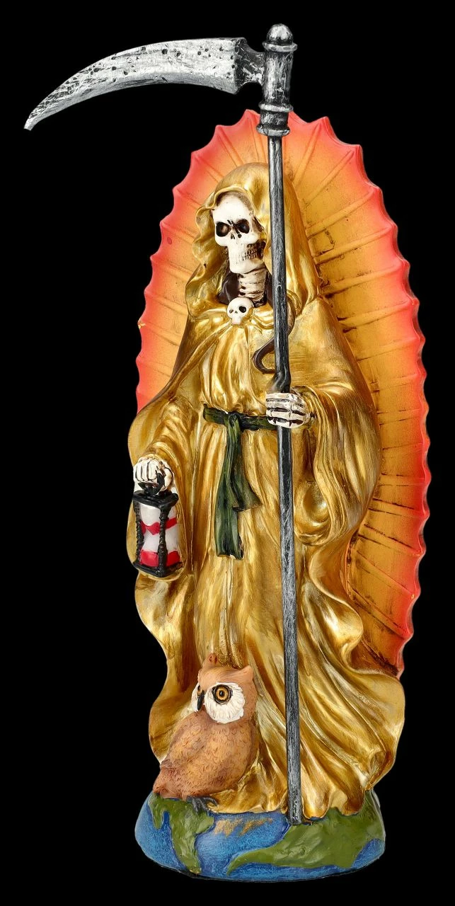 Die Laterne in der rechten Hand und seine Sense in der linken, steht der Sensenmann in edlem goldenen Umhang als Heiliger Tod vor einem roten Strahlenkranz auf der Erde. Ob reich oder arm – er ist es schließlich, der letztendlich alle in sein Reich holen wird. Dass er kluge Entscheidungen über den Zeitpunkt stellt, beweist die Eule als Symbol der Weisheit, die ihn begleitet. Der 18,5 cm hohe, 7,5 cm breite und 6 cm tiefe Sensenmann im goldenen Umhang ist aus handbemaltem Kunststein (Polyresin). Die Santa Muerte Figur ist eine magische Deko zum Dia de los Muertos, bei der zwischen dem 31. Oktober und 2. November unterhaltsam an die Verstorbenen gedacht wird.