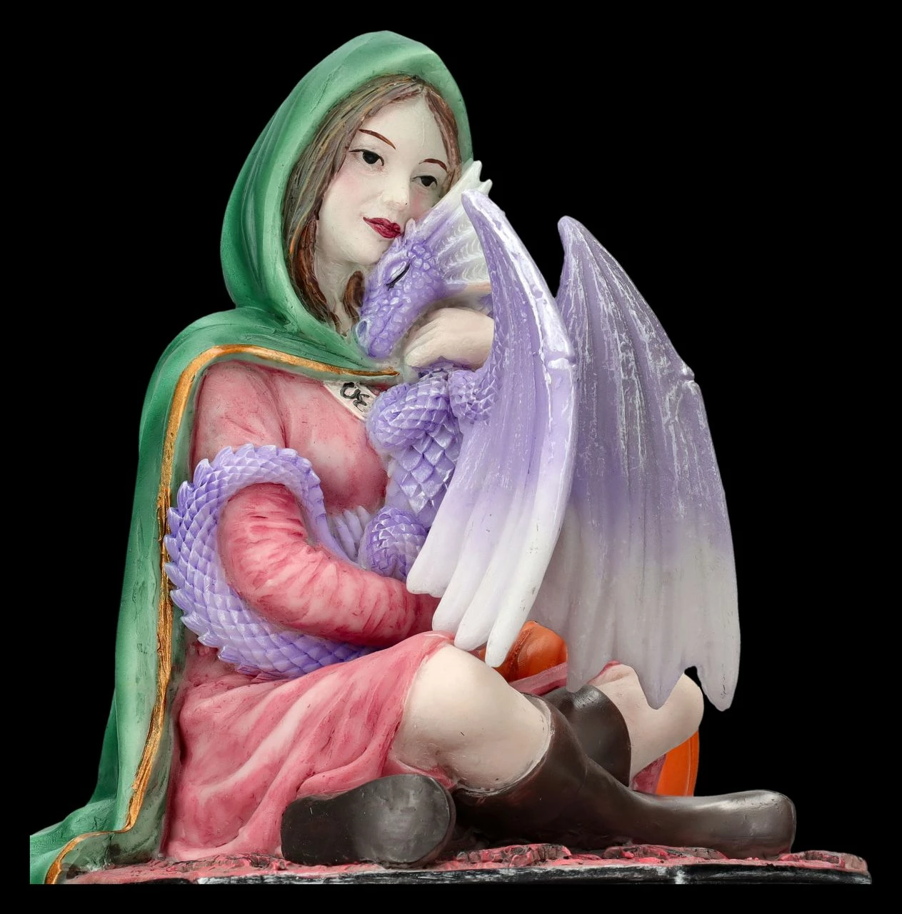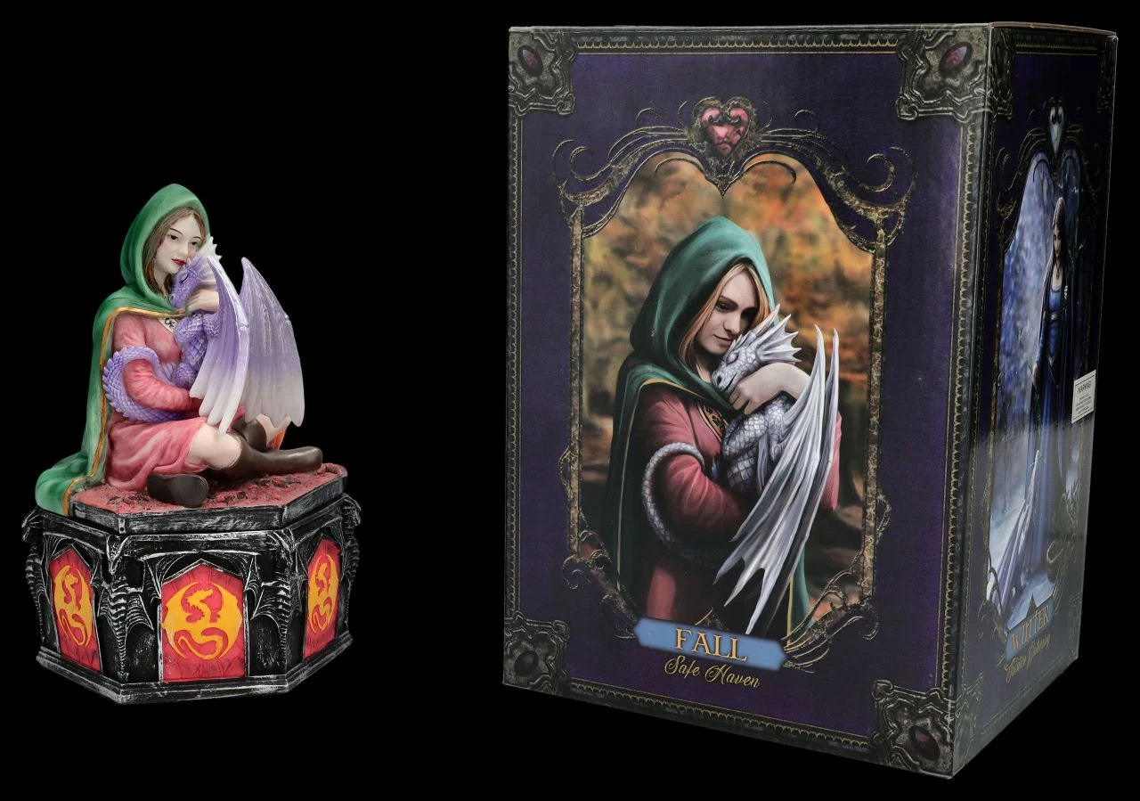 In ihrem grünen Umhang über dem roten Kleid und Gummistiefeln sitzt die schöne Elfe auf dem herbstlich gefärbten Waldboden und hält zärtlich ihren kleinen violetten Drachen in den Armen. Eigentlich wollte sie nur schnell einen Kürbis für ihre Herbstdekoration holen, aber ihr Drache scheint sie schon sehr vermisst zu haben. Die kunstvolle Schatulle mit dem Motiv ‚Dragon Friendship – Herbst‘ der beliebten Fantasykünstlerin Anne Stokes ist absolut bezaubernd. Die aufwändig und liebevoll aus handbemaltem Kunststein (Polyresin) gefertigte Schatulle ist 19 cm hoch, 13 cm breit und 11,5 cm tief. Innen hat die zauberhafte Schatulle mit den Maßen H: 5,5 cm / B: 9 cm / T: 10 cm Platz für kleine Kostbarkeiten. Die Schatulle mit dem Drachenmotiv kommt inklusive eines toll bedruckten Geschenkkartons und ist für alle Freunde magischer Wesen und alle Anne Stokes-Fans ein wunderbares Geschenk. In unserem Shop gibt es übrigens weitere märchenhafte Motive aus dieser Serie.