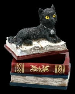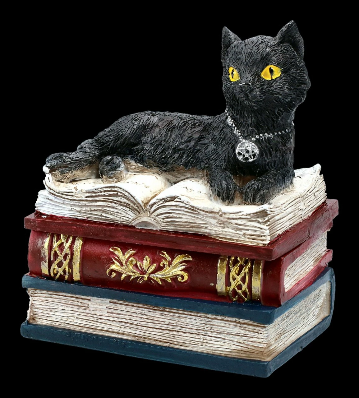 Die schwarze Hexenkatze liegt, geschmückt mit einer Kette mit Pentagramm-Anhänger, aufmerksam auf einem roten magischen Buch und bewacht alles, was sich irgendwann in der Schatulle befindet. Die Schatulle ist aus detailreich handbemaltem Kunststein (Polyresin) gefertigt und 12 cm hoch, 10 cm breit und 7,5 cm tief. Das Fach hat innen eine Größe von H 3,5 x B 8 x 5 cm und ist zum Beispiel besonders für ein Schmuckgeschenk geeignet. Hier haben Sie eine wirklich ungewöhnliche Geschenkverpackung.