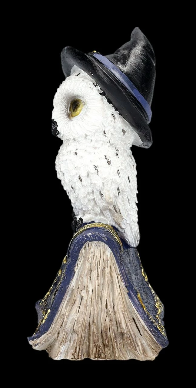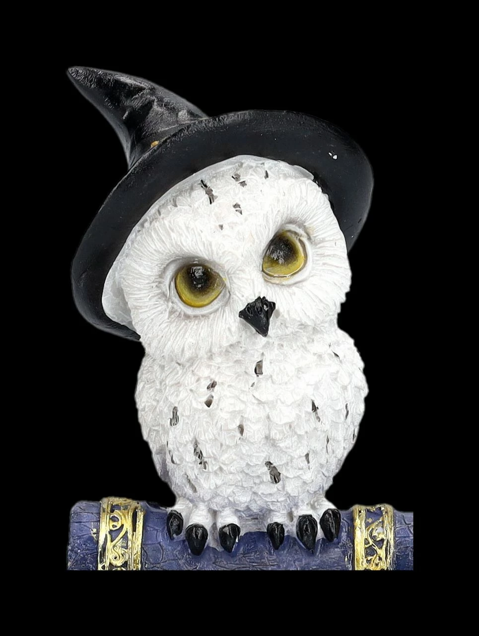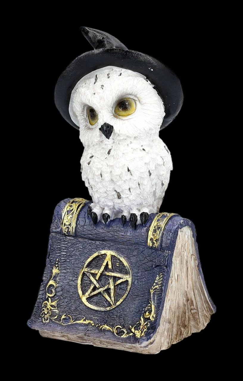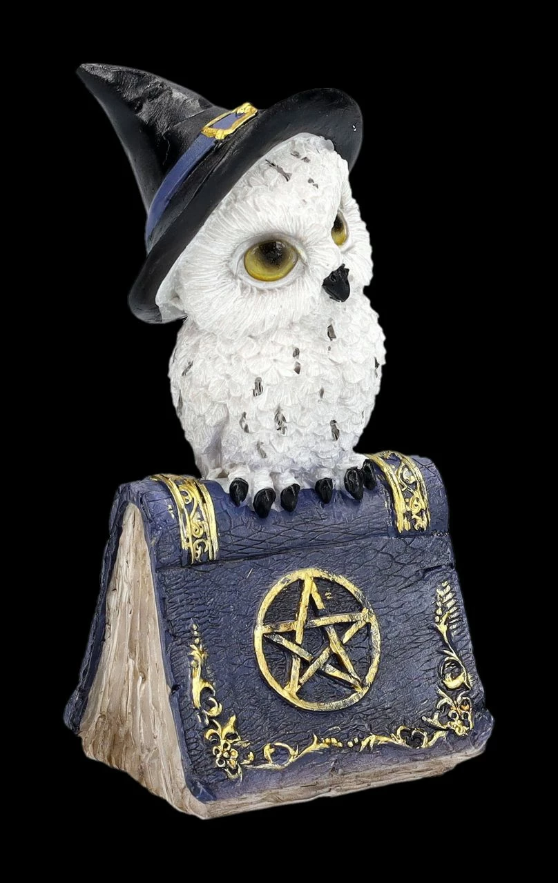 Zwar hat sich die kleine Schneeeule den Zauberhut aufgesetzt, aber kann sie die magischen Sprüche in dem blauen Zauberbuch mit dem Pentagramm auf dem Umschlag auch lesen? Mit treuherzig geneigtem Kopf und großen Augen blickt diese kleine Schneeeule den Betrachter an. Die 11,5 cm hohe, 5,5 cm breite und 5 cm tiefe Schneeeulen-Figur auf dem blauen Zauberbuch wurde aus liebevoll handbemaltem Kunststein (Polyresin) gefertigt. Für alle Eulen-Fans ist sie eine magische Deko und ein fantastisches Geschenk.