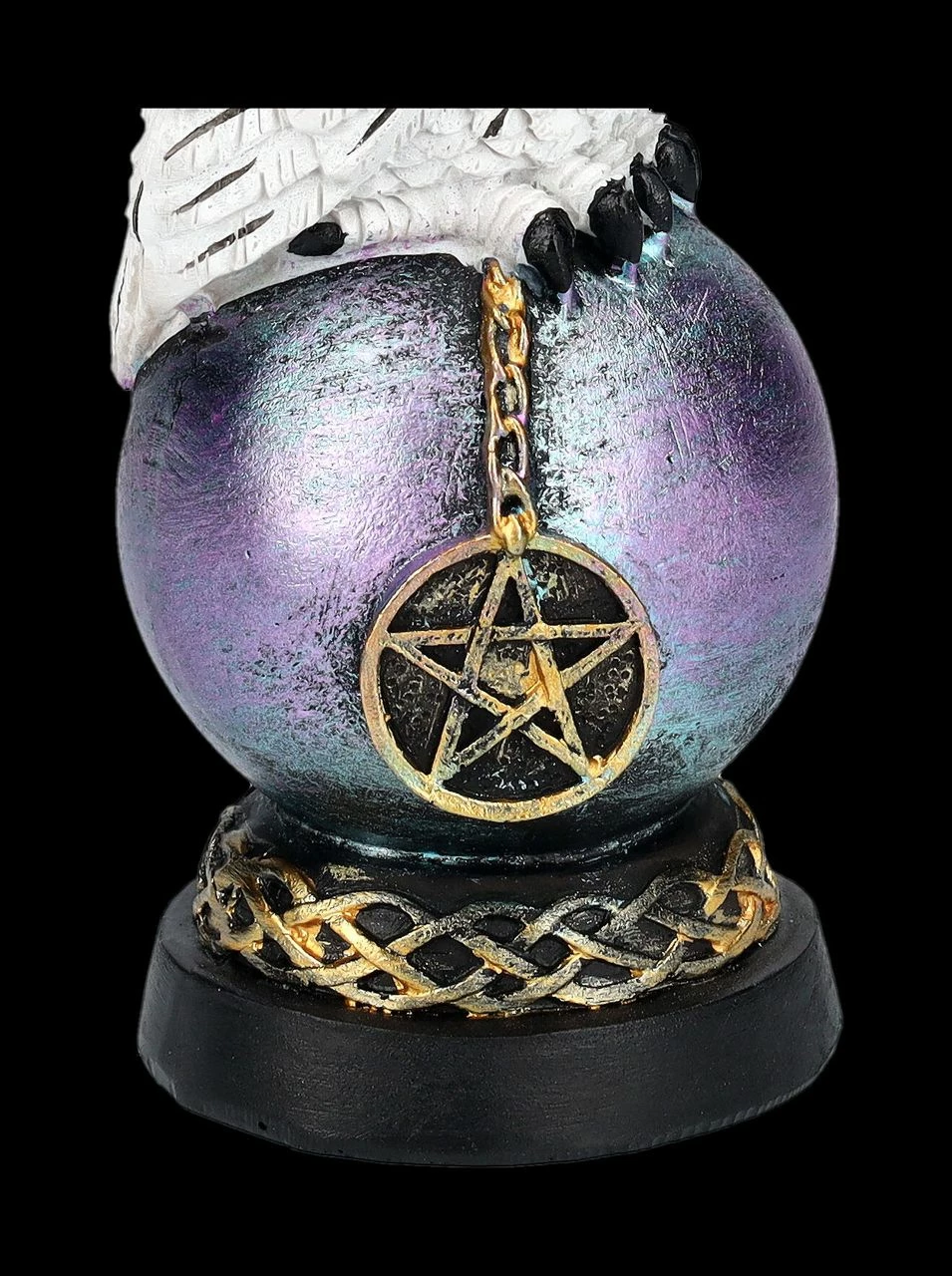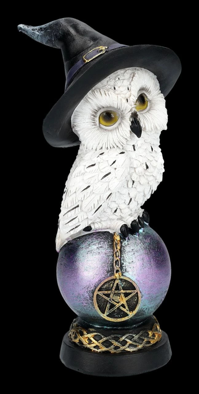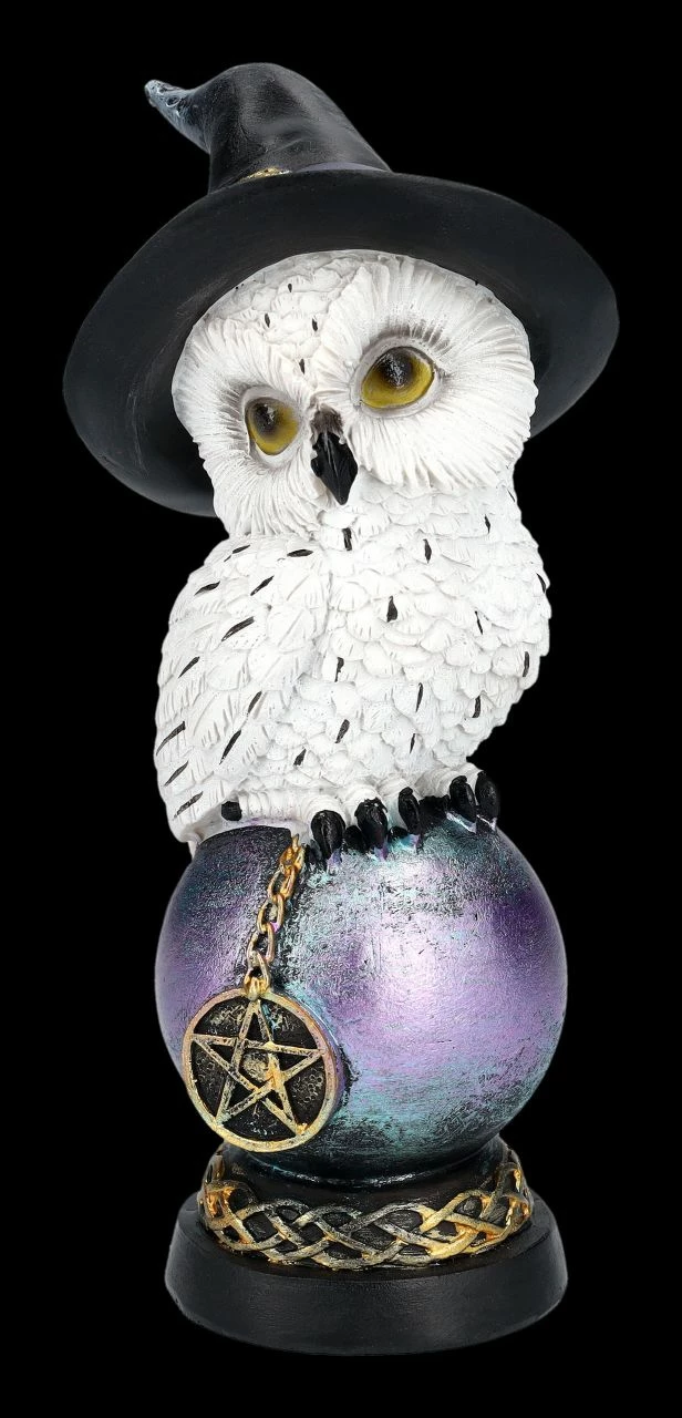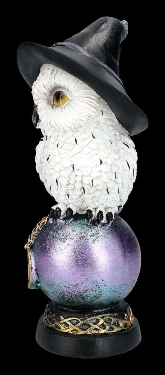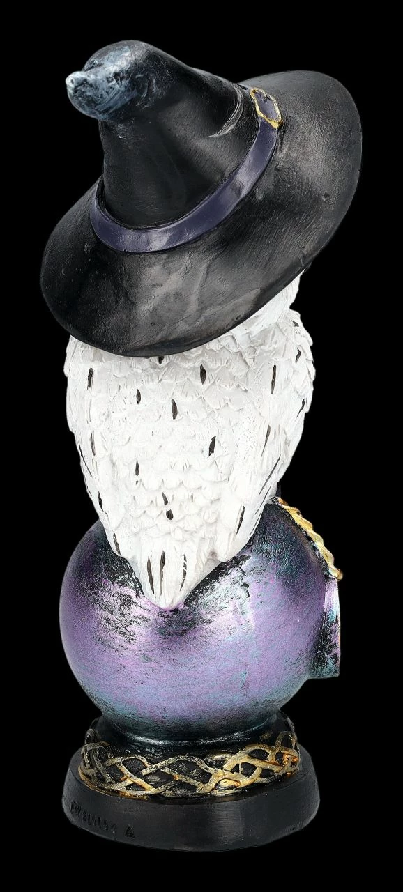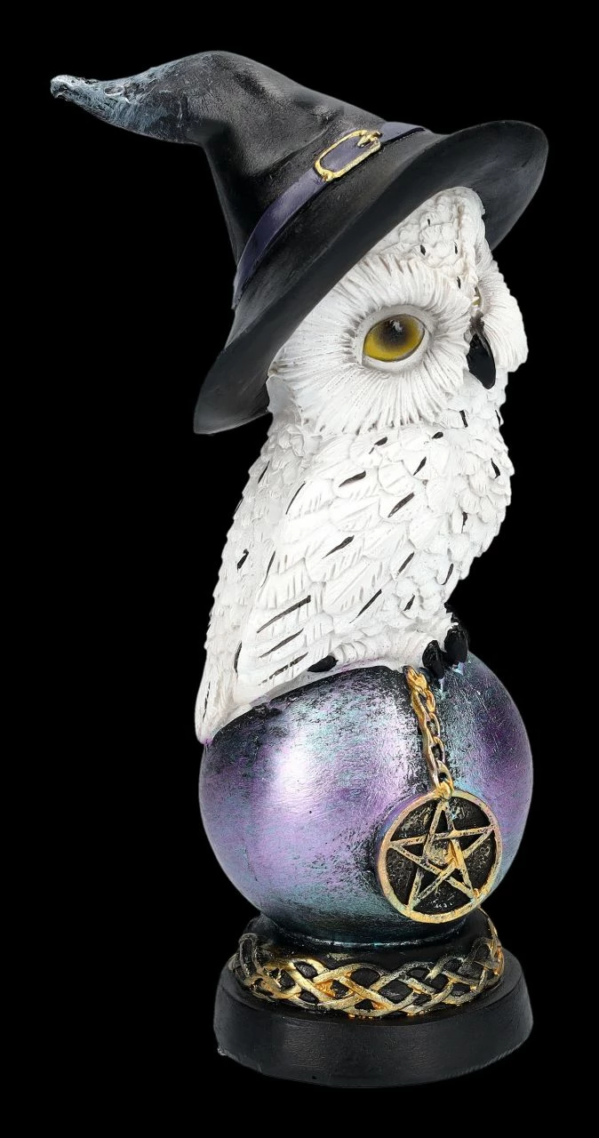 Auf einer auf einem Sockel stehenden magischen Kugel hat sich eine kleine Schneeeule mit einem Zauberhut auf dem Kopf niedergelassen. In den Krallen hält die mit ihren großen Augen nach links blickende Eule ein Amulett mit einem Pentagramm. Die 20 cm hohe, 7 cm breite und 7 cm tiefe Schneeeulen-Figur wurde aus liebevoll handbemaltem Kunststein (Polyresin) gefertigt. Für Eulen-Fans ist sie – vielleicht auch gleich in Gesellschaft mit unserer nach rechts blickenden Schneeeule – ein fantastisches Geschenk.