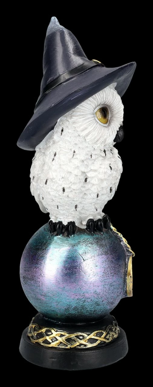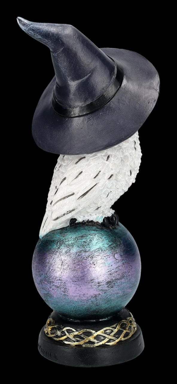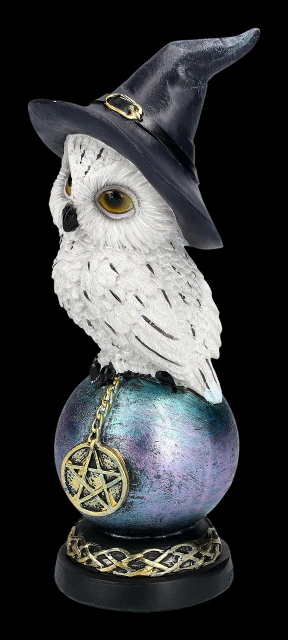 Mit treuherzig geneigtem Kopf und großen Augen blickt diese kleine Schneeeule mit dem Zauberhut nach rechts. Sie sitzt auf einer auf einem Sockel stehenden magischen Kugel und hält mit den Krallen ein Amulett mit einem Pentagramm fest. Die 20 cm hohe, 7 cm breite und 7 cm tiefe Schneeeulen-Figur wurde aus liebevoll handbemaltem Kunststein (Polyresin) gefertigt. Für Eulen-Fans ist sie – vielleicht auch gleich in Gesellschaft mit unserer nach links blickenden Schneeeule – ein fantastisches Geschenk.