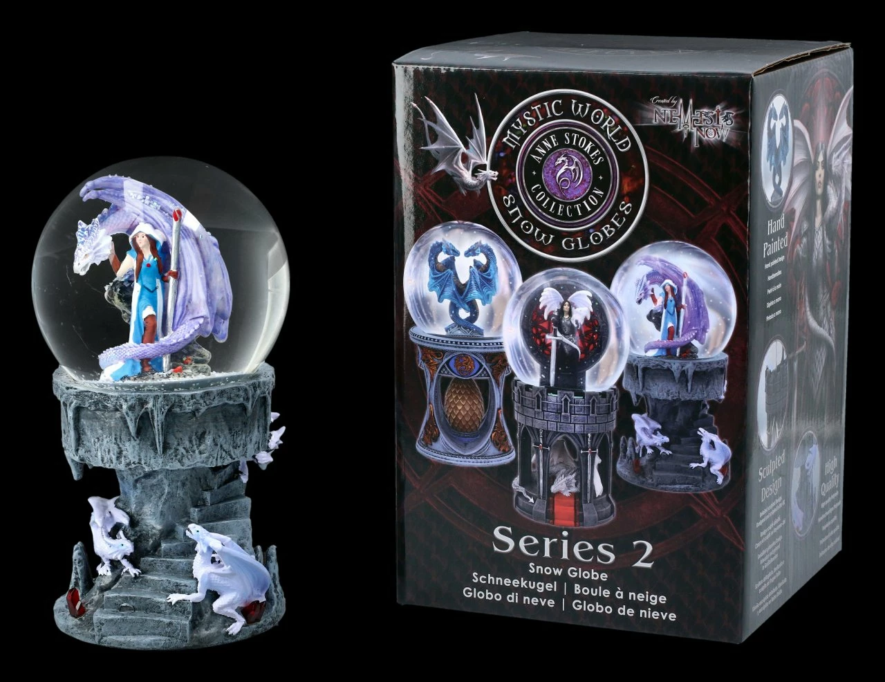 Wenn sich nach dem Schütteln der Kugeln der Schneesturm gelegt hat, ist der Blick frei auf die tapfere Magierin, die gemeinsam mit ihrem Drachen in dier Kugel eingeschlossen ist. Tröstend streicht sie ihm über den Kopf, Er muss sich nicht fürchten – auch nicht vor den beiden Biestern, die auf den Stufen warten. Denn die Kugel schützt sie auch davor. Sobald die Magierin ihren Zauberstab benutzt, sind sie und ihr Drache ohnehin befreit. Für alle Fans der berühmten Fantasy-Künstlerin Anne Stokes ist hier eine wunderschöne Schneekugel aus liebevoll handbemaltem Kunststein (Polyresin) mit Glaskugel aus der Serie 2. Der Turm mit der Glaskugel hat eine Höhe von 18 cm und einen Durchmesser von 10 cm. Die Schneekugel wird in einer Geschenkbox geliefert und ist somit auch ein wunderbares Geschenk für alle, die Schneekugeln sammeln und lieben.