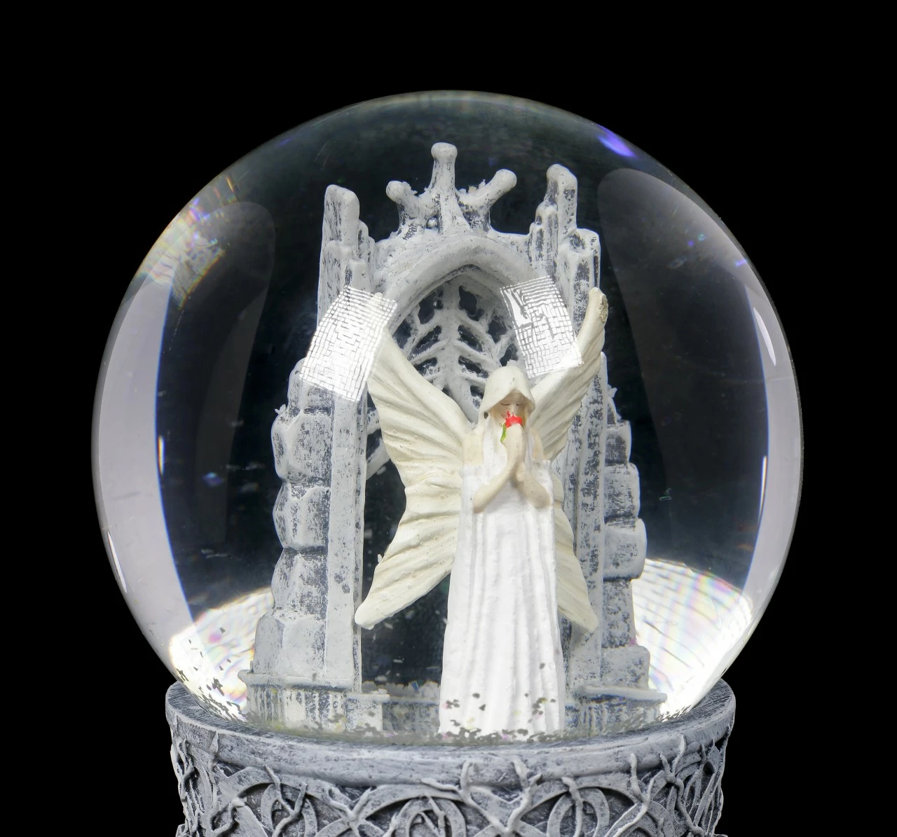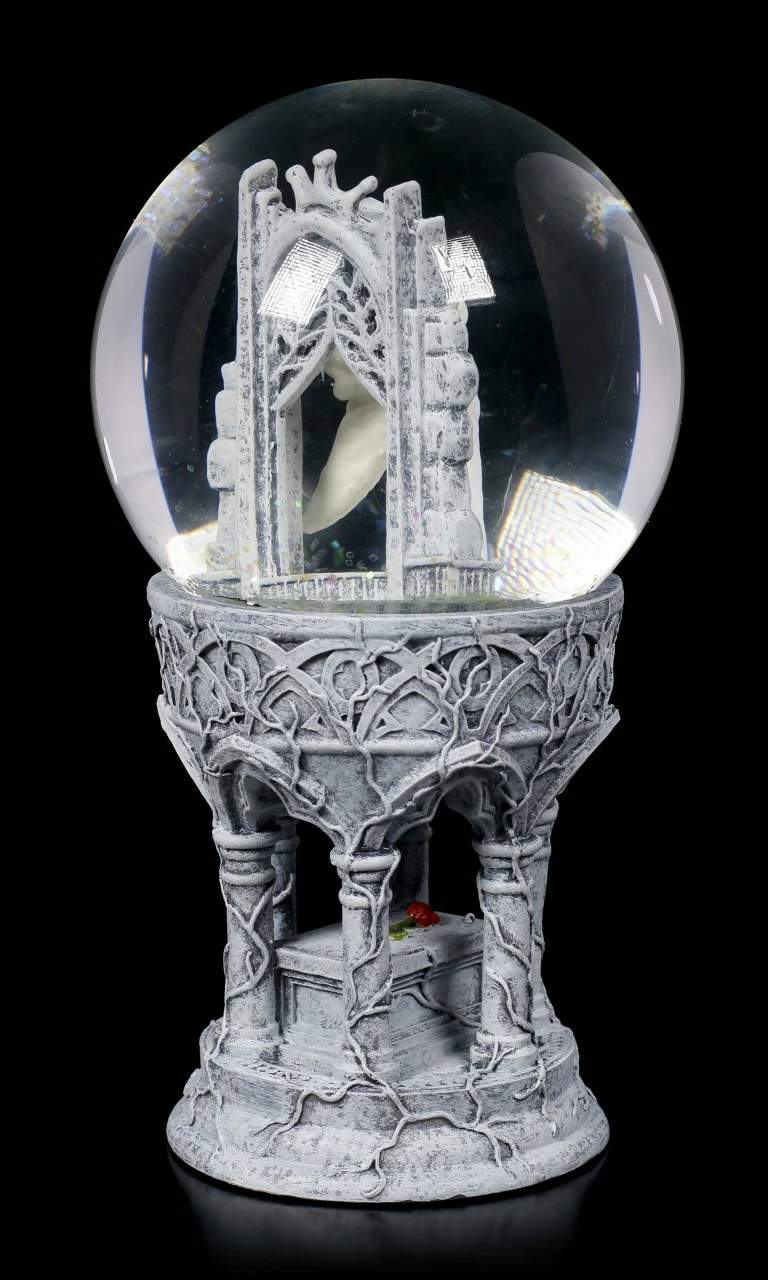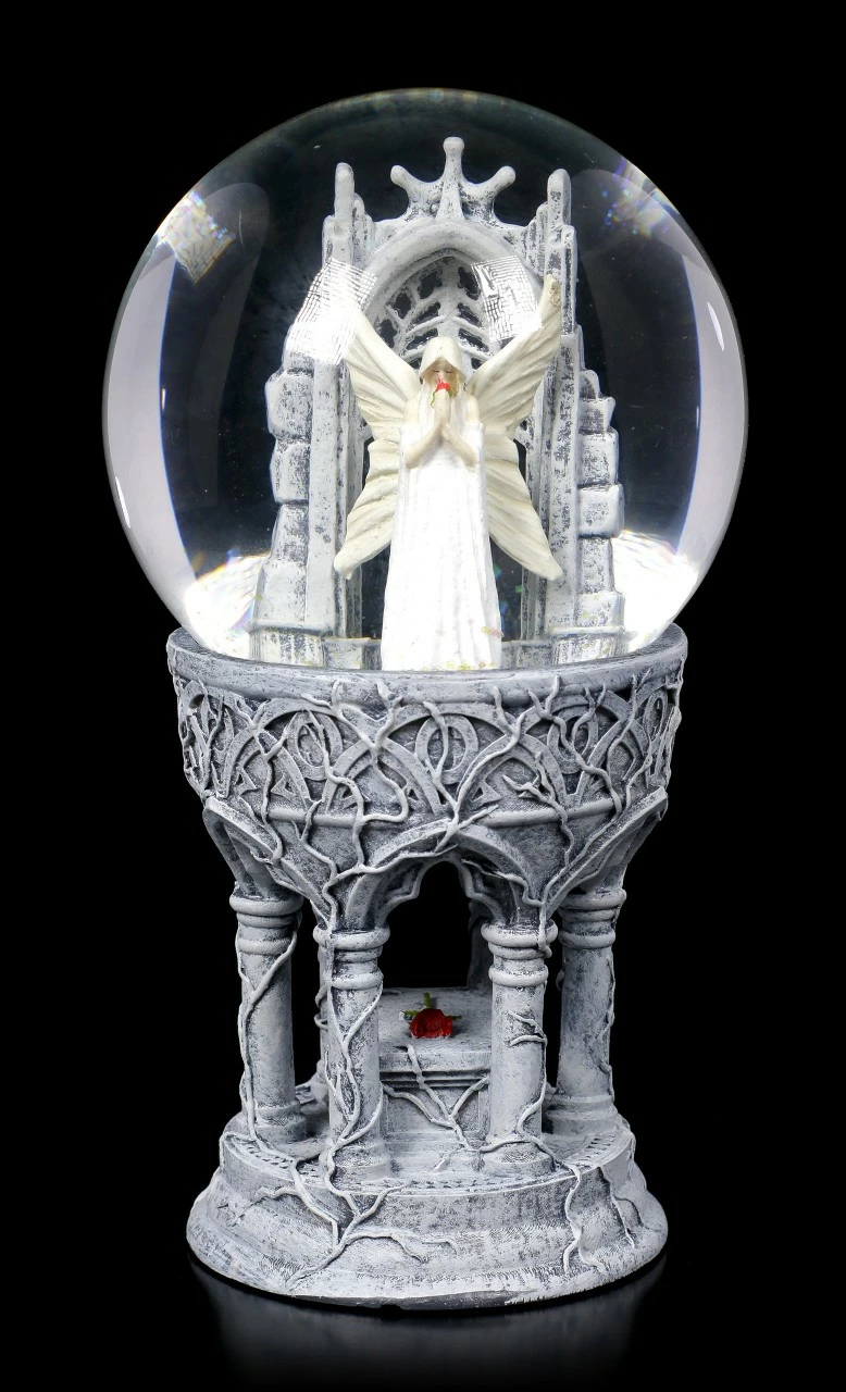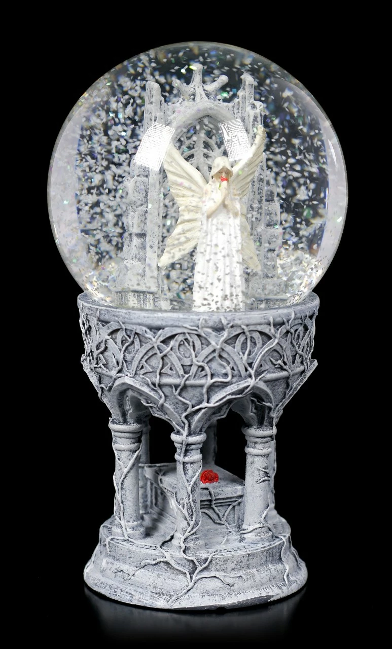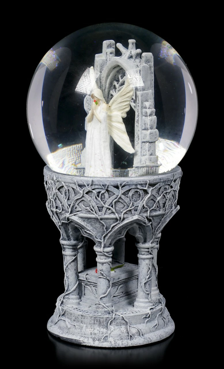 Die umwerfende, detailreiche Schneekugel Only Love Remains entsprang der Fantasie der Gothic- und Fantasy-Künstlerin Anne Stokes. Eine weißhaarige Elfe steht mit gesenktem Kopf in einer Kathedrale. Sie trägt ein langes weißes Spitzenkleid. Hinter ihr öffnen sich weiße Flügel, auf denen sich dasselbe Muster wie auf dem Kleid wiederholt. Mit geschlossenen Augen hält sie einen kleinen Strauß roter Rosen an ihr Gesicht, sie scheint ganz in Träumereien versunken zu sein. Nach allem, was geschehen ist, nach allem, was gesagt und getan wurde, ist alles, was übrig bleibt, Liebe. Diese handbemalte Schneekugel aus Kunststein (Polyresin) und Glas ist das perfekte Geschenk für einen lieben Menschen, der bei jedem Schütteln ein bisschen Magie sehen möchte.