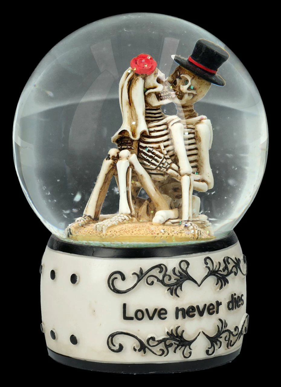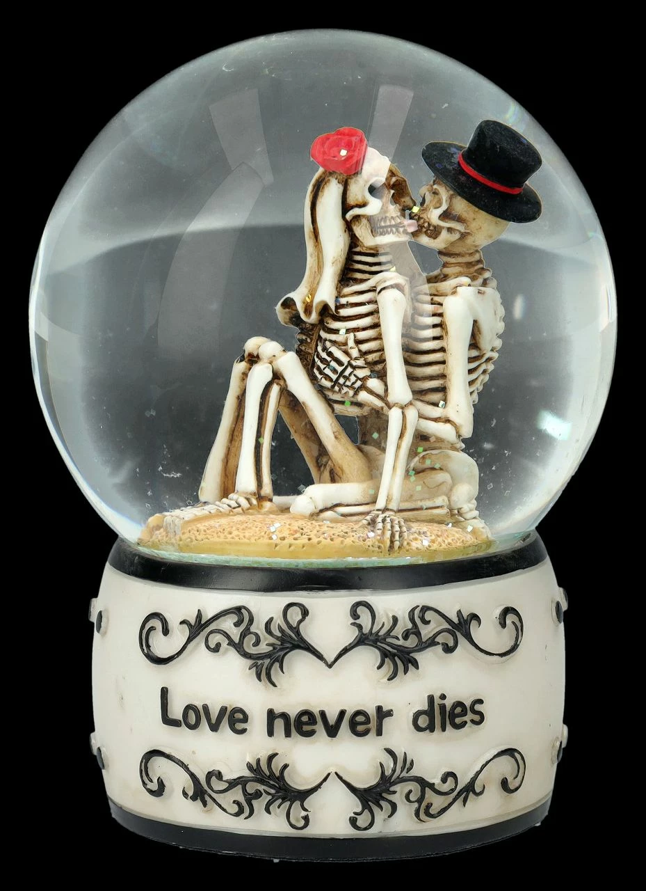 ‚Love never dies‘, also ‚Wahre Liebe stirbt nie‘ steht nicht nur in schwarzen Lettern auf auf dem schön verzierten weißen Sockel, auch das Skelettpaar in der Schneekugel beweist es. Ob das Glas der Schneekugel nun durchscheinend ist, oder der Schnee herumwirbelt – sie lassen sich bei ihrem Liebesspiel nicht stören. Bis zur roten Rose in ihrem Haar und seinem schwarzen Zylinder mit rotem Band sind die beiden, wie auch der Sockel, detailreich aus handbemaltem Kunststein (Polyresin) entstanden. Die 13,5 cm hohe, 10 cm breite und 10 cm tiefe wunderbare Schneekugel mit dem sich zärtlich küssenden Skelettpaar ist als Liebesbeweis ein perfektes Geschenk für die oder den Liebsten.