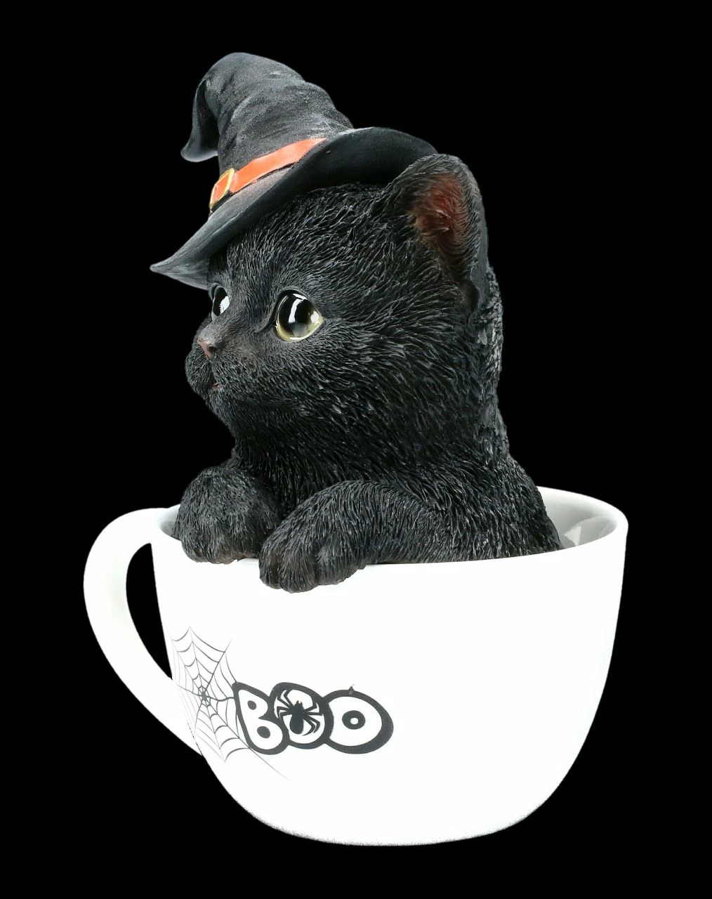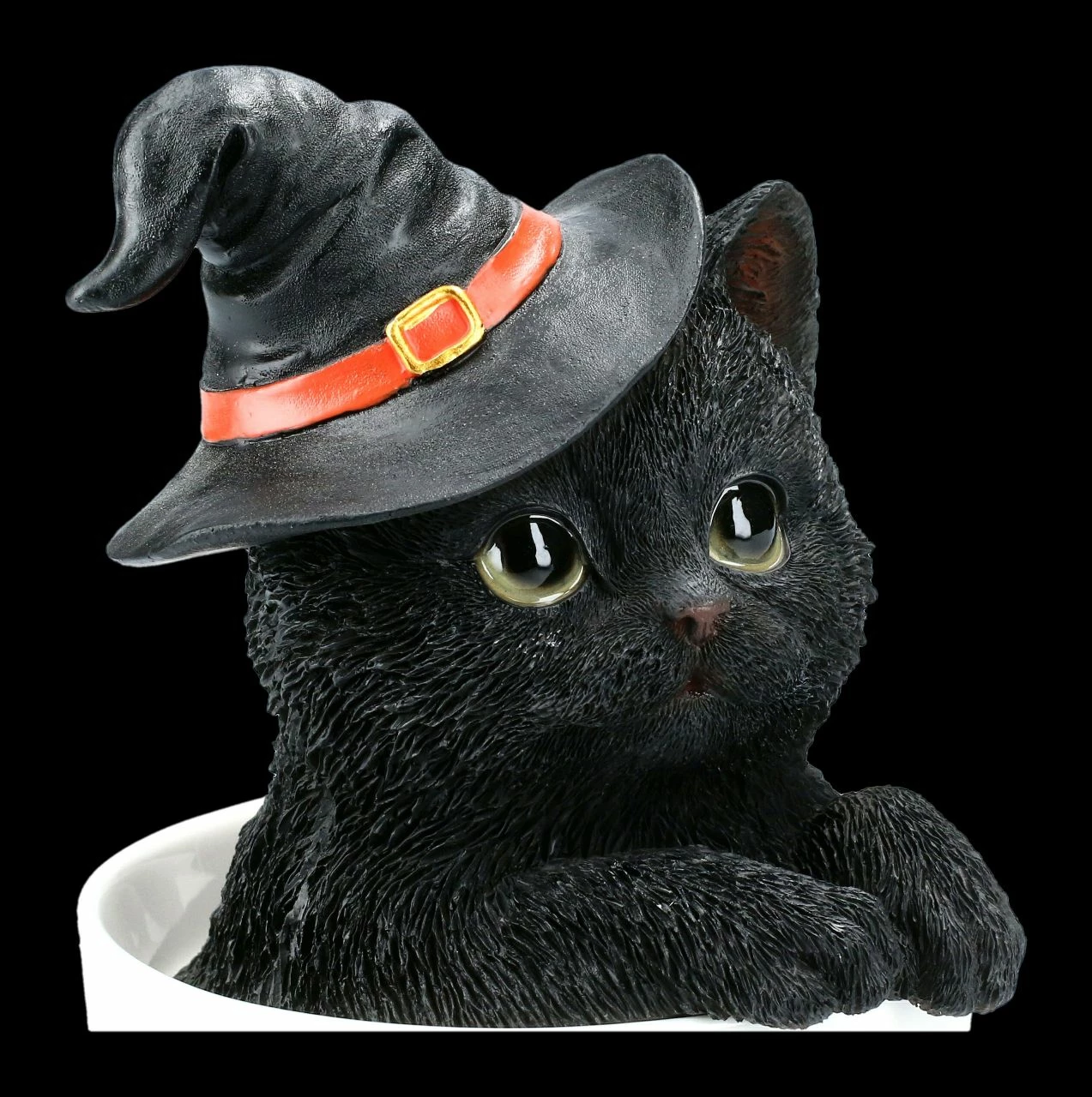 Schwarzer Kaffee hat jetzt in meiner Tasse keinen Platz mehr, denn da habe ich es mir schon bequem gemacht. Das scheint diese süße schwarze Hexen-Katze mit ihren glänzenden Augen und unschuldigem Blick zu sagen. Der Hexenhut zeigt auch, dass man gar nicht erst versuchen soll, Kaffee in diese Tasse zu gießen. Die lustige schwarze Hexen-Katze in der Tasse ist 16,0 cm hoch, 12,0 cm breit und 10,0 cm tief und aus handbemaltem Kunststein (Polyresin). Ein zauberhaftes Geschenk für Katzenfreunde.und das nicht nur zu Halloween.