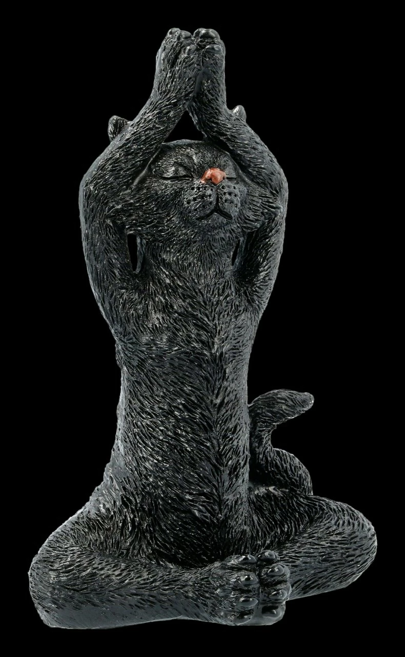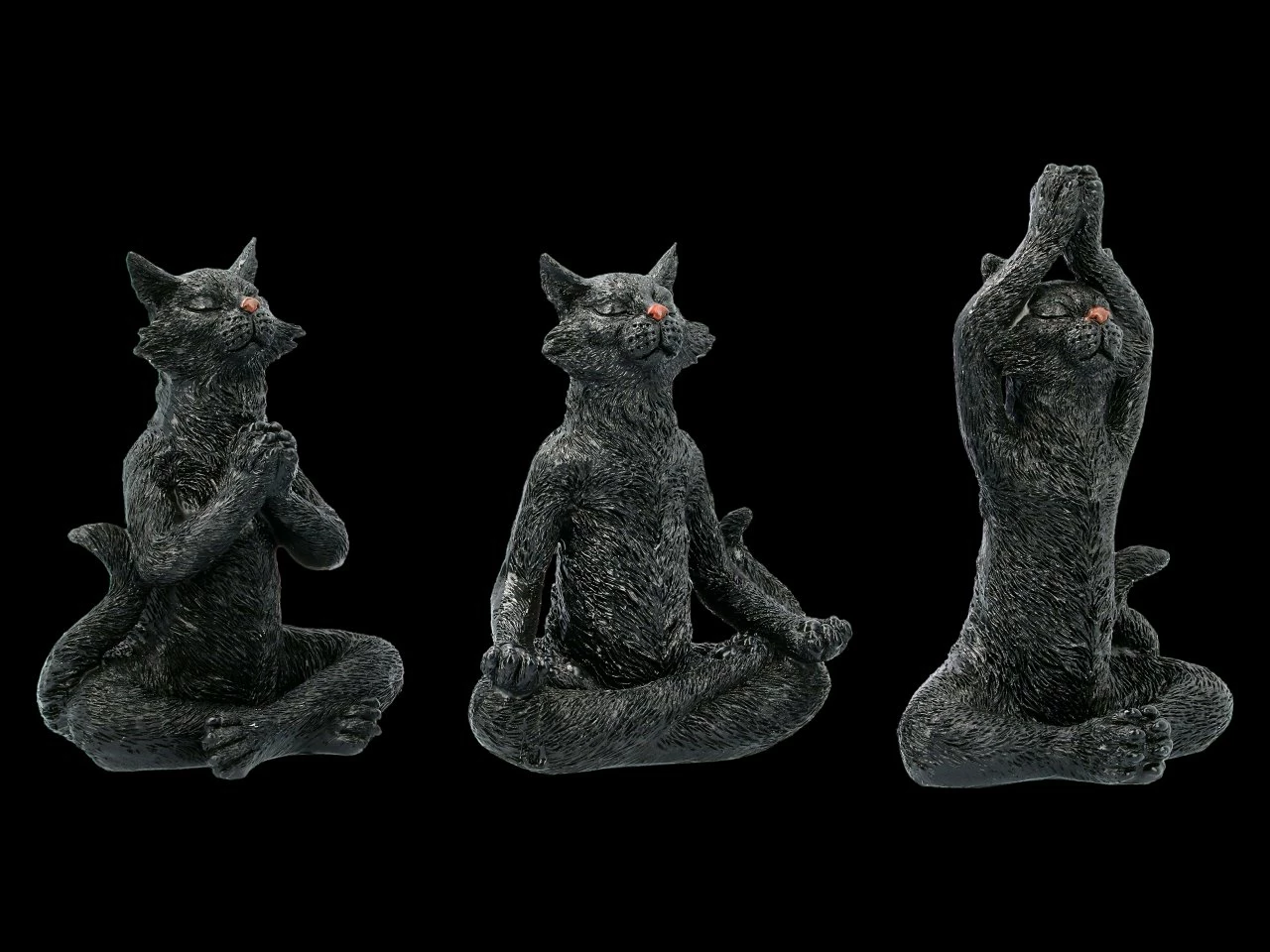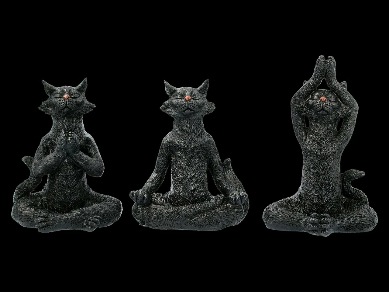 Voll konzentriert, so dass ihre Nasenspitzen schon richtig rot sind, machen diese drei witzigen schwarzen Katzen ihre morgendlichen Yogaübungen. Die drei aus handbemaltem Kunststein (Polyresin) gefertigten schwarzen Katzen sind mit ihrer Höhe von 19 – 22 cm, der Breite von 13,5 – 14,5 cm und der Tiefe von 8,5 – 10 cm die perfekte Deko für jedes Yogastudio. Das 3er Set ist aber natürlich auch ein sehr nettes Geschenk für Ihre Yogafreunde.
