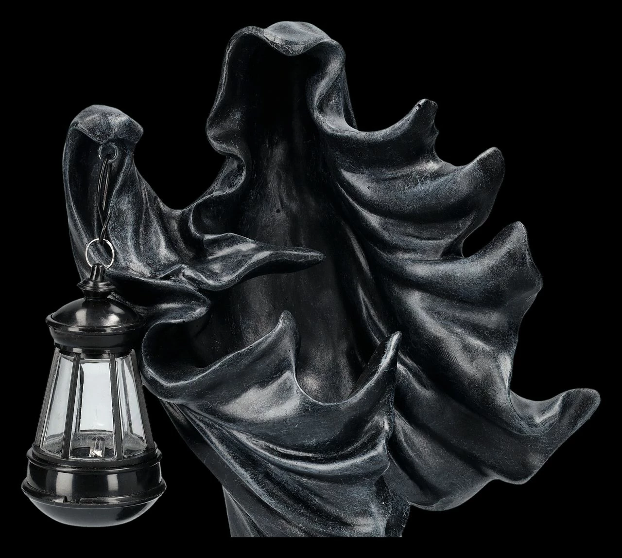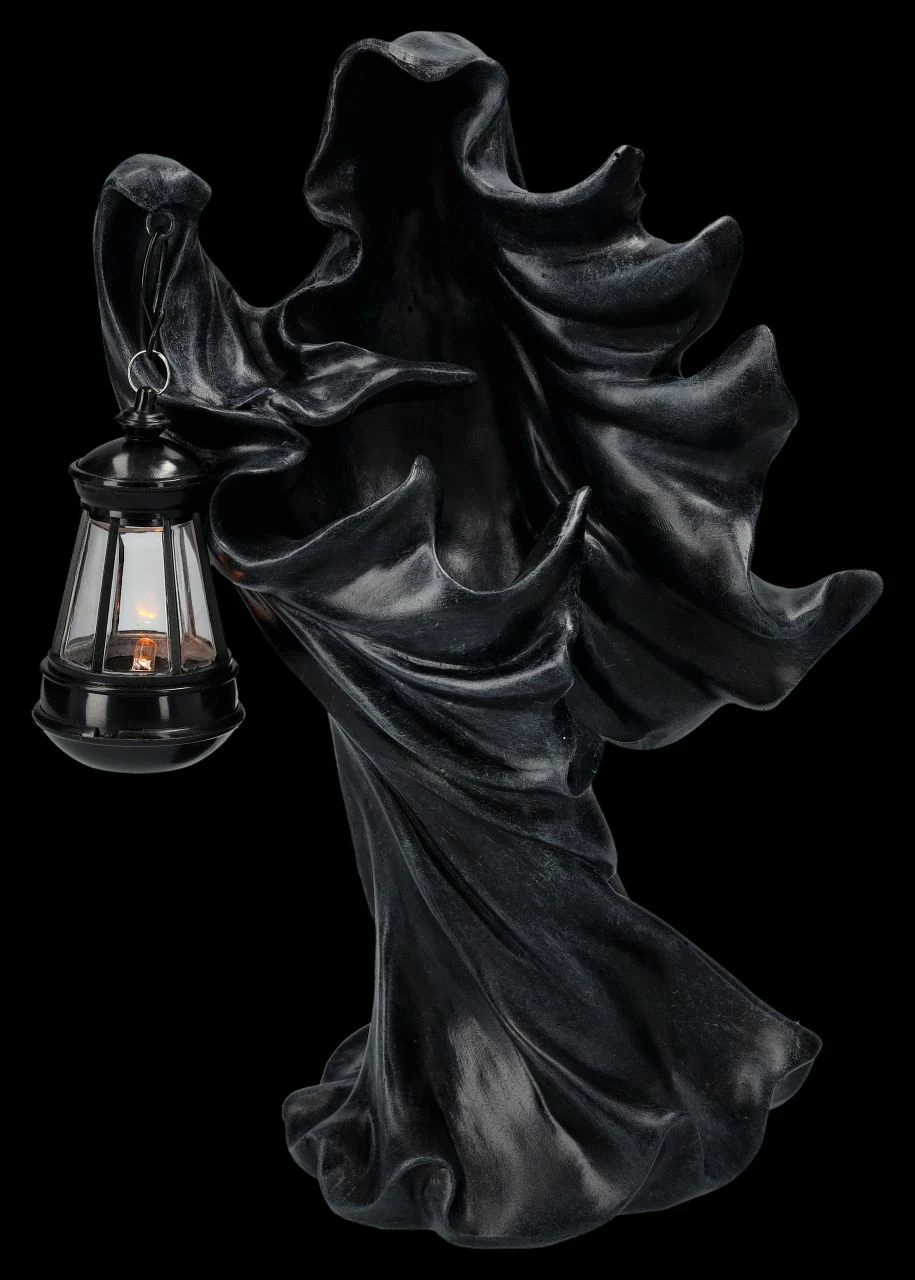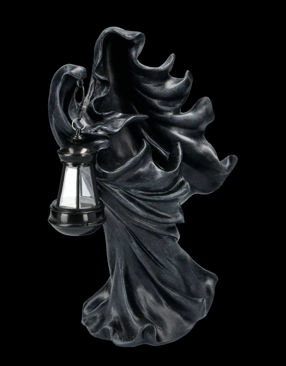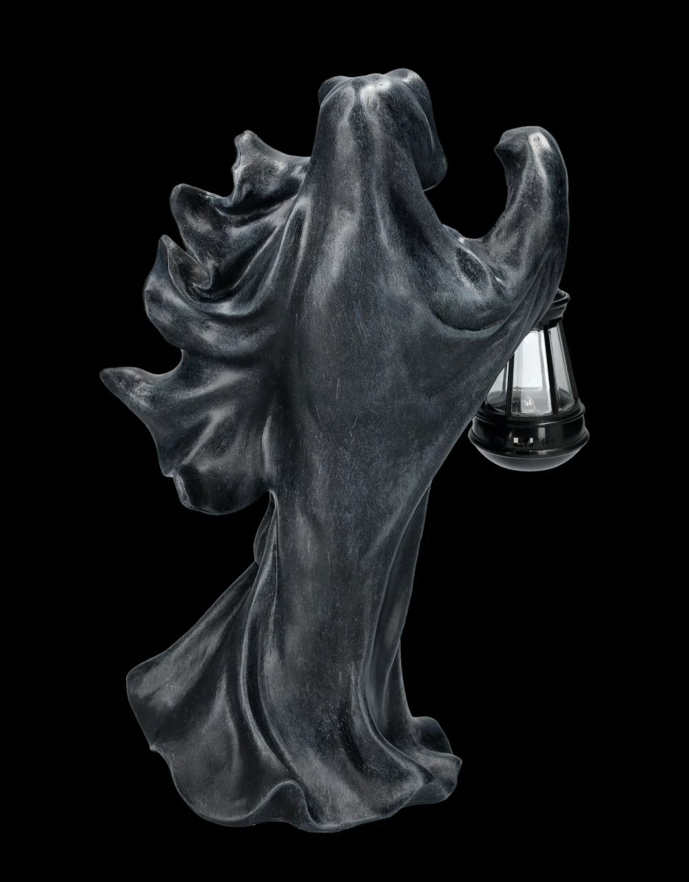 Als hätte ihn der Sturm herangeweht, so wirkt dieser Sensenmann in seiner sturmzerzausten Kutte. Vor der Haustür zeigt er mit der im Dunklen magisch leuchtenden LED Laterne allen wo es lang geht. Der eine oder andere wird sicher zögern zu klingeln, wenn er den Grim Reaper mit der Laterne vor der Tür entdeckt. Die Figur des Sensenmannes wurde aus handbemaltem Kunststein (Polyresin) gefertigt und ist 25,5 cm hoch, 17,5 cm breit und 9,5 cm tief. Selbst für magisch raue Winternächte.ist dieser Grim Reaper mit der Laterne eine etwas gruselige Deko. Für die batteriebetriebene LED Beleuchtung werden 3 LR41 Batterien benötigt, die jedoch nicht in der Lieferung enthalten sind.