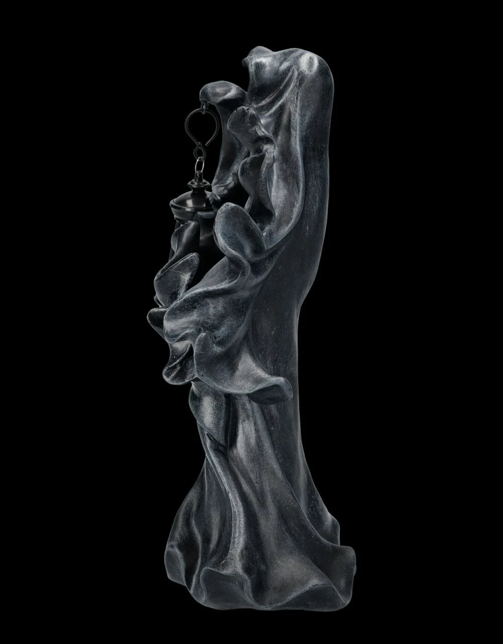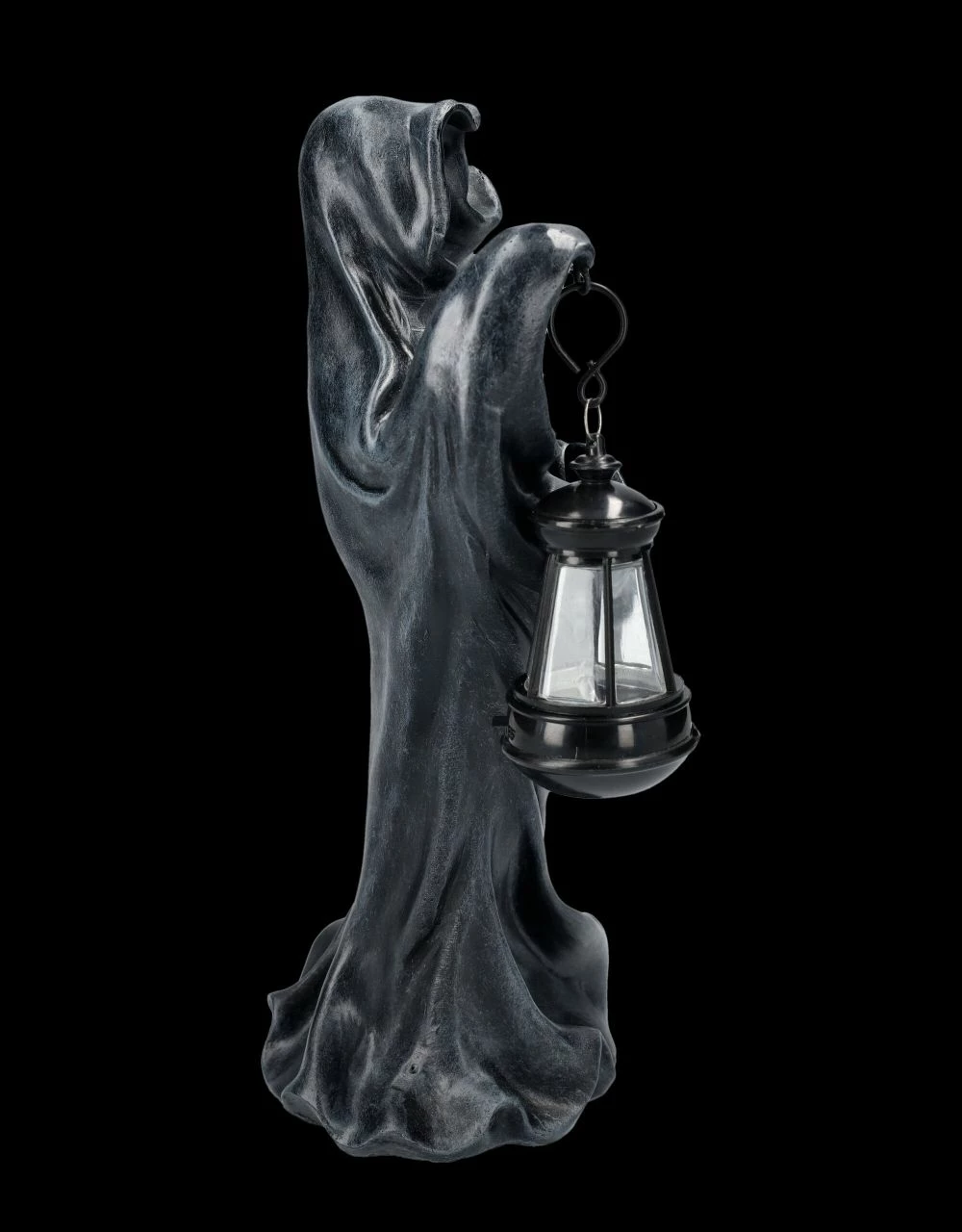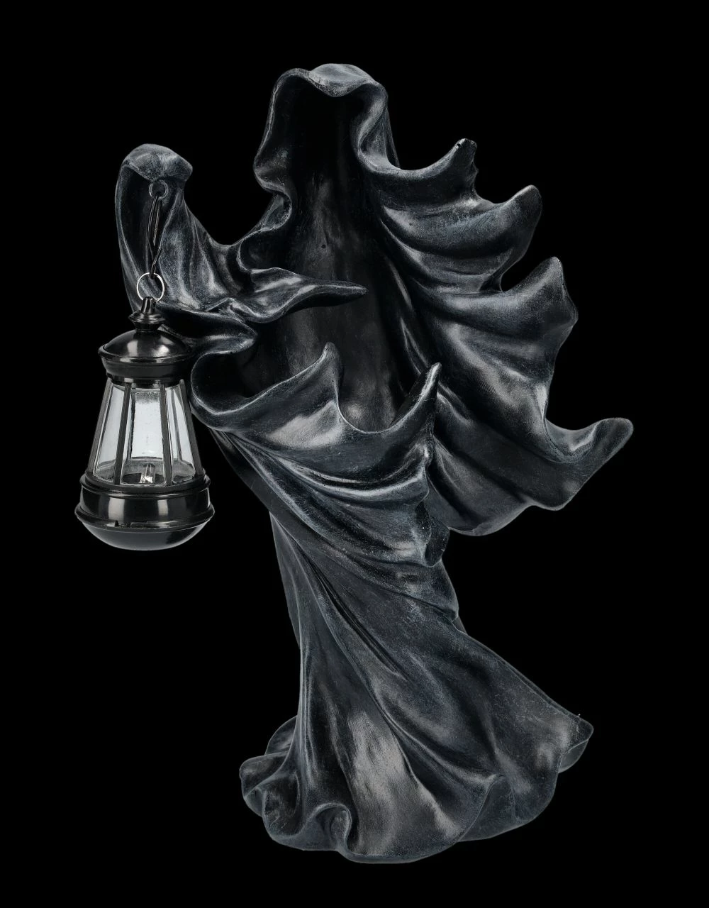 Als hätte ihn der Sturm herangeweht, so wirkt dieser Sensenmann in seiner sturmzerzausten Kutte. Vor der Haustür zeigt er mit der im Dunklen magisch leuchtenden LED Laterne allen wo es lang geht. Der eine oder andere wird sicher zögern zu klingeln, wenn er den Grim Reaper mit der Laterne vor der Tür entdeckt. Die Figur des Sensenmannes wurde aus handbemaltem Kunststein (Polyresin) gefertigt und ist 25,5 cm hoch, 17,5 cm breit und 9,5 cm tief. Selbst für magisch raue Winternächte.ist dieser Grim Reaper mit der Laterne eine etwas gruselige Deko. Für die batteriebetriebene LED Beleuchtung werden 3 LR41 Batterien benötigt, die jedoch nicht in der Lieferung enthalten sind.