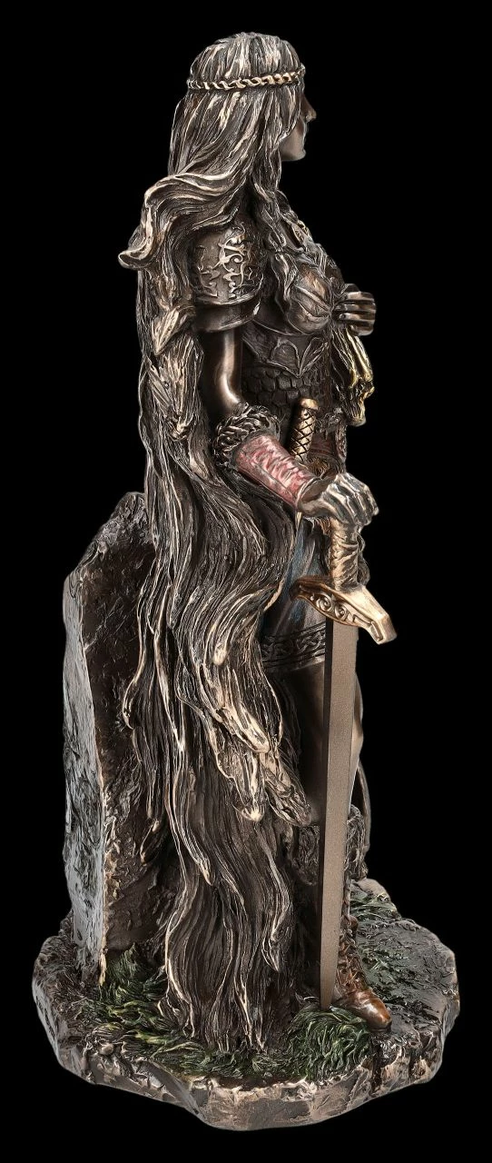 Sif, die germanische Göttin der Fruchtbarkeit ist nach der nordischen Mythologie Thors Gattin. Sie war nach der Edda berühmt für ihr sagenhaftes langes goldenes Haar, das nach der Mytholgie vermutlich die wogenden und reifen Getreidefelder symbolisierte. Eine Getreidegarbe hält diese fantastische Figur der Göttin in ihrem linken Arm, während sie mit der rechten ein Schwert hält und an ihrer Seite ein Schild mit dem Sonnenemblem steht. Die 21 cm hohe, 12 cm breite und 9,5 cm tiefe Figur der germanischen Göttin Sif aus der Studio Collection von Veronese wurde außerordentlich detailreich in Rüstung und mit hohen Stiefeln aus edel bronziertem und fein coloriertem Kunststein (Polyresin) gefertigt. Thors Gemahlin Sif ist nicht nur für alle die den nordischen Göttern huldigen, ein wunderbares und sehr dekoratives Geschenk.