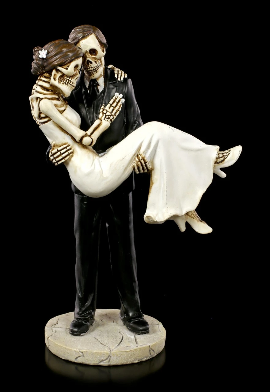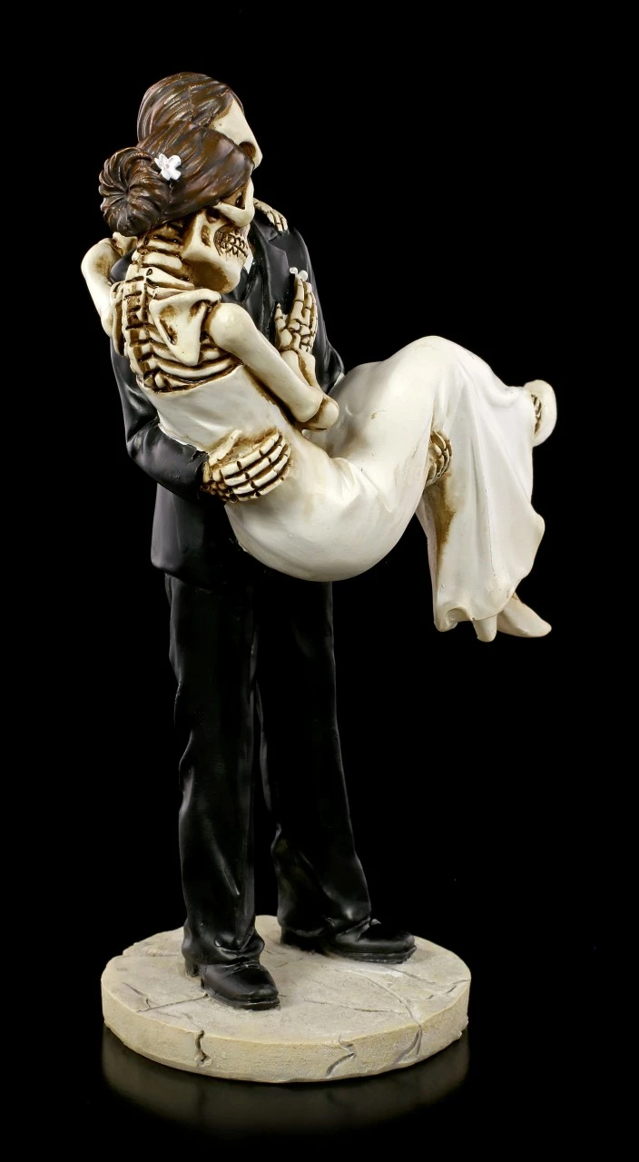 Der Bräutigam trägt die Braut auf Händen. Das Skelett Brautpaar ist entweder das perfekte Geschenk zu einer Hochzeit oder eine wunderbare Tischdeko für die Tafel, an der nach der Trauung gefeiert wird. Das handbemalte Hochzeitspaar aus Kunststein (Polyresin) wird Sie mit all den vielen Details begeistern.