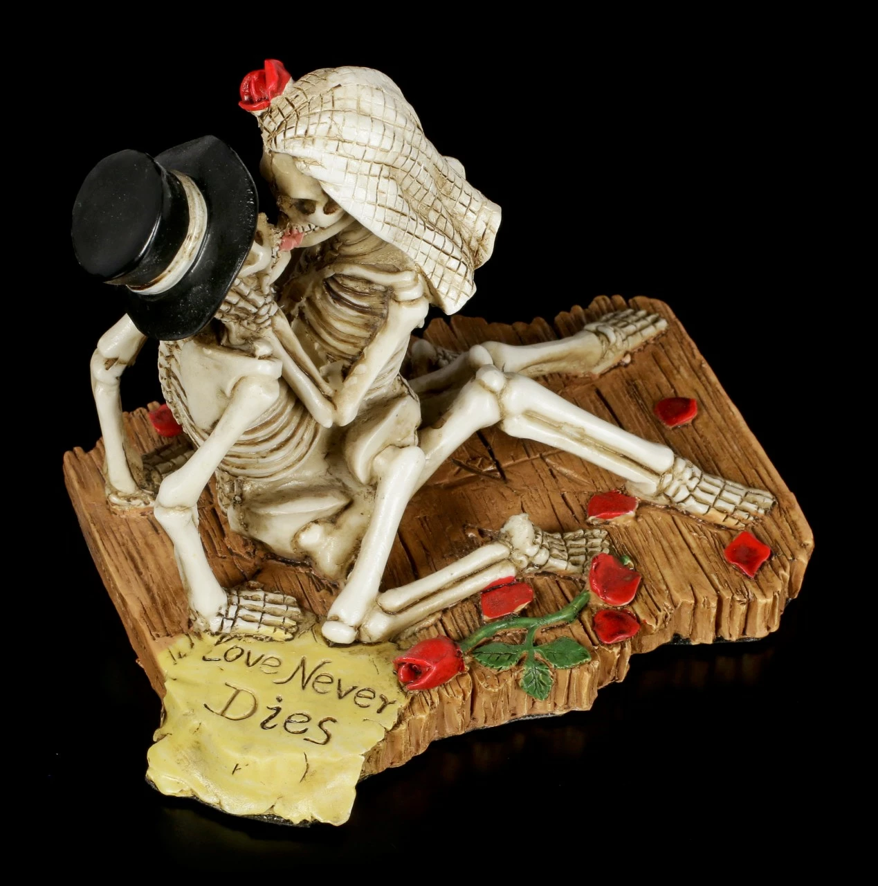 Love never Dies! Liebe gibt es auch unter den Untoten. Das jung vermählte Skelettpaar kann gar nicht genug von einander bekommen. Das süße handbemalte Kunststein Pärchen ist das perfekte Hochzeitsgeschenk oder auch das perfekte Topping für eine Torte, wenn der Bäcker etwas findig ist.