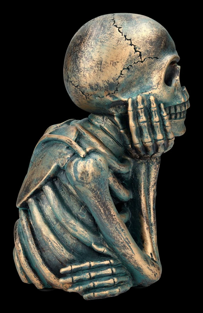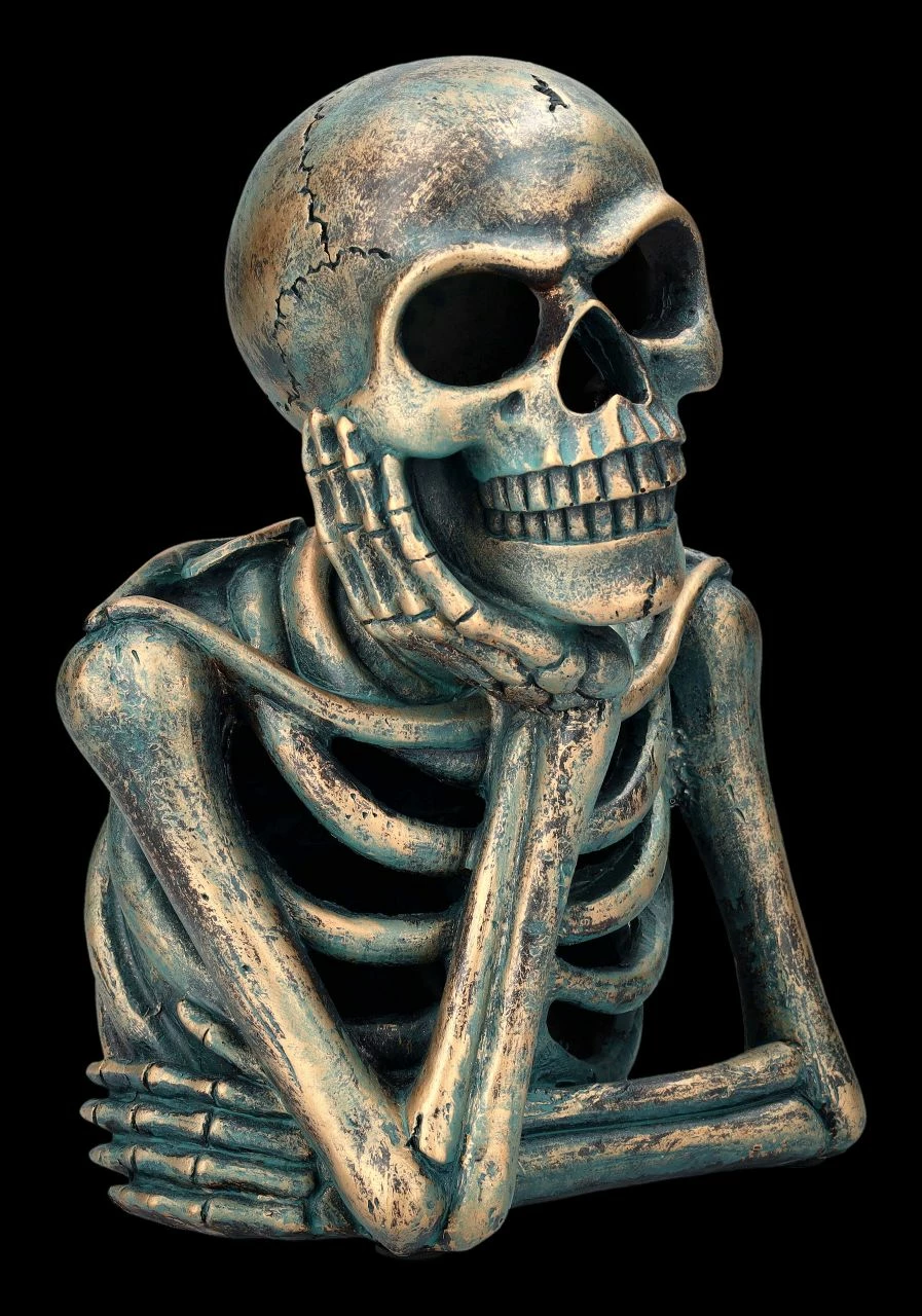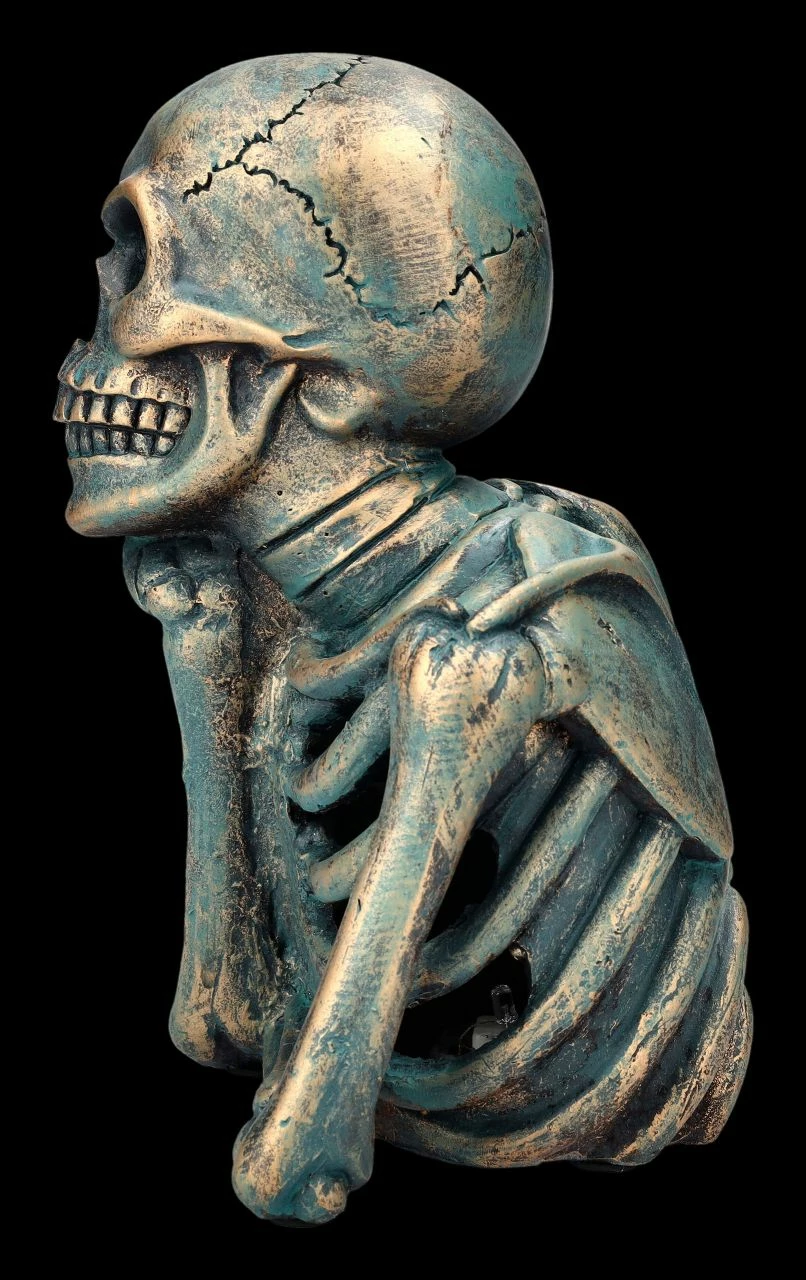 Zu lange über den Sinn des Lebens gegrübelt? Sieht man sich das lachende Skelettgesicht des Denkers an, wird es wohl viele lustige Momente gegeben haben. Die 24 cm hohe, 17 cm breite und 13 cm tiefe Skelett Büste ‚Der Denker‘ wurde detailreich aus handbemaltem Kunststein (Polyresin) gefertigt. Ob auf dem Schreibtisch, dem Sideboard oder im Regal – der Denker wird überall und in jedem Ambiente zum absoluten Blickfang. Aber auch als witziges Geschenk für Menschen mit Humor ist der Denker natürlich sehr gut geeignet.