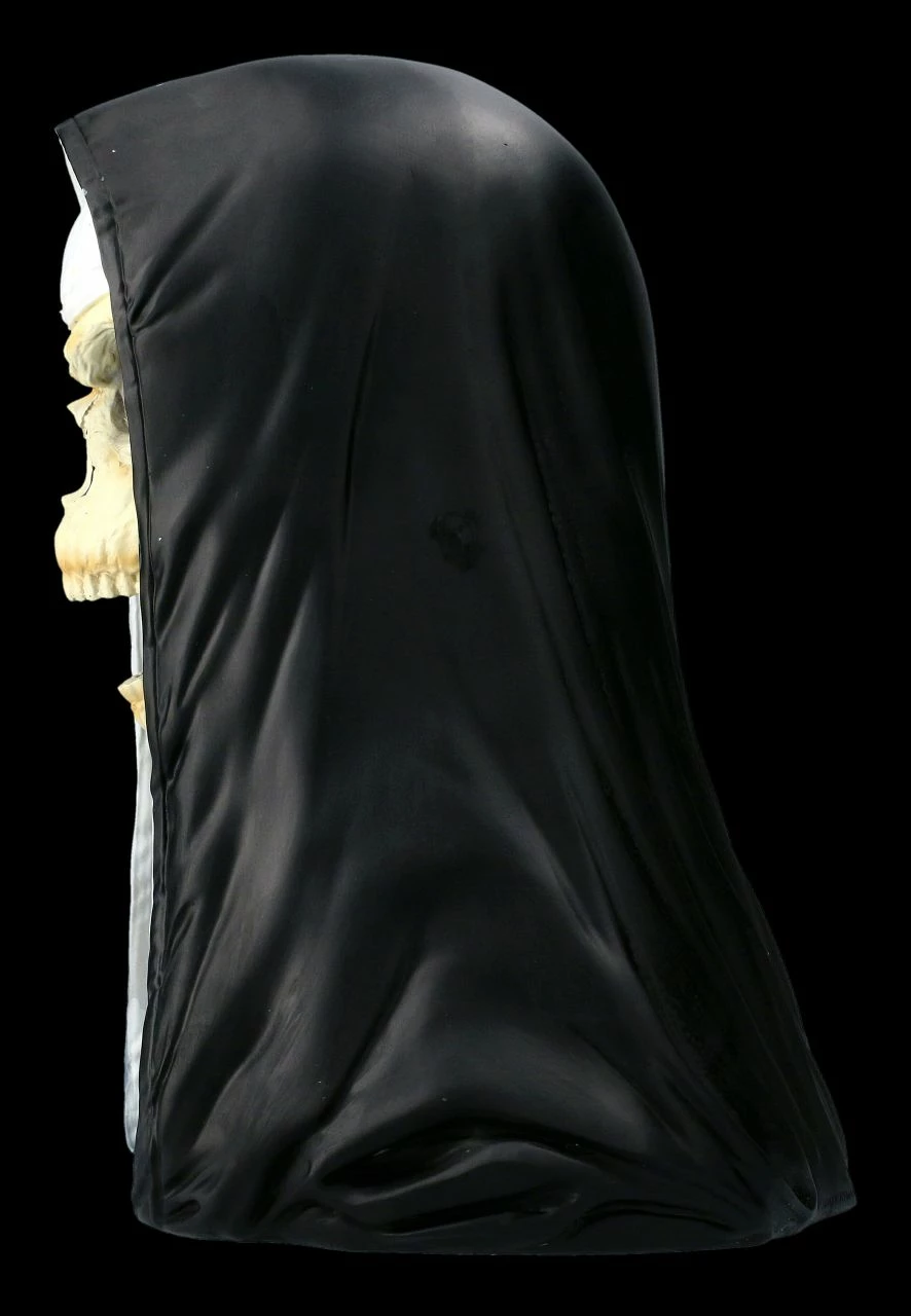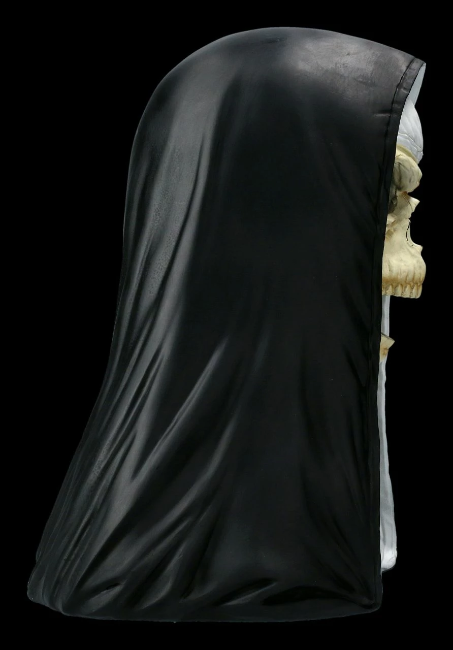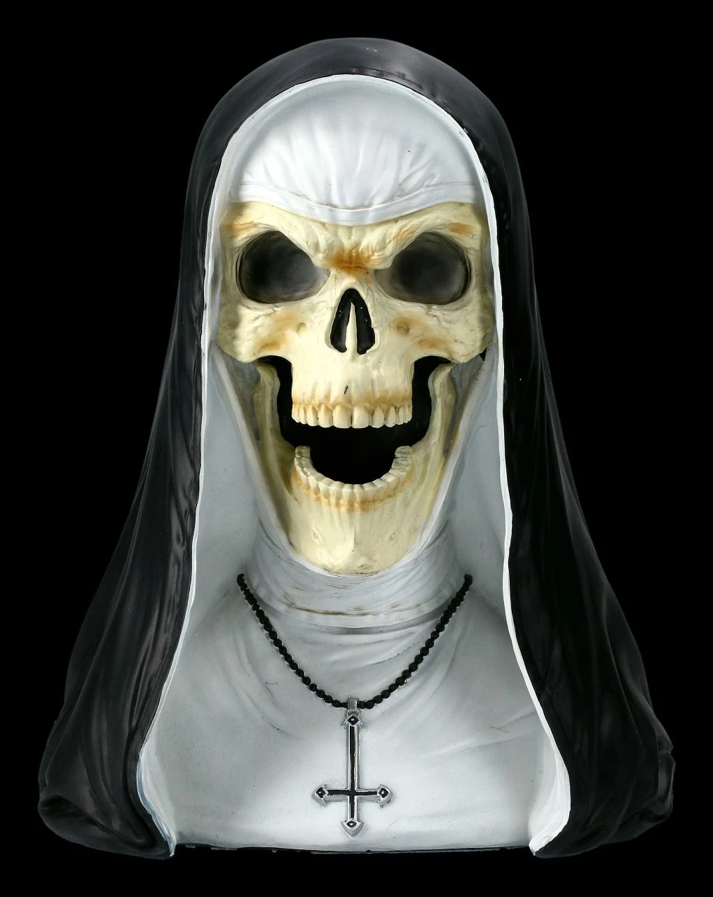 Der bekannte britische Gothic Künstler James Ryman hat auch diese düster fantasievolle Skulptur einer Nonne mit Totenschädel geschaffen. Die Büste der Nonne Sister Mortis mit der schwarzen Halskette und dem verkehrt herum angebrachten Kreuz ist außerordentlich detailreich aus Kunststein (Polyresin) gefertigt und sorgsam handbemalt. Mit ihrer Höhe von 29 cm, der Breite von 23 cm und der Tiefe von 18 cm ist diese Büste der Nonne Sister Mortis von James Ryman ein faszinierendes Dekoobjekt, das garantiert alle Blicke auf sich ziehen wird.