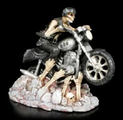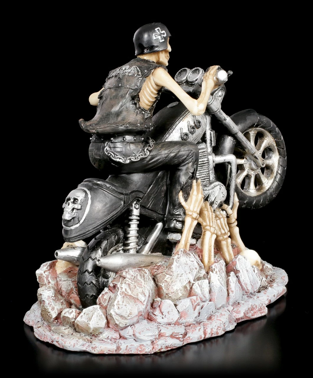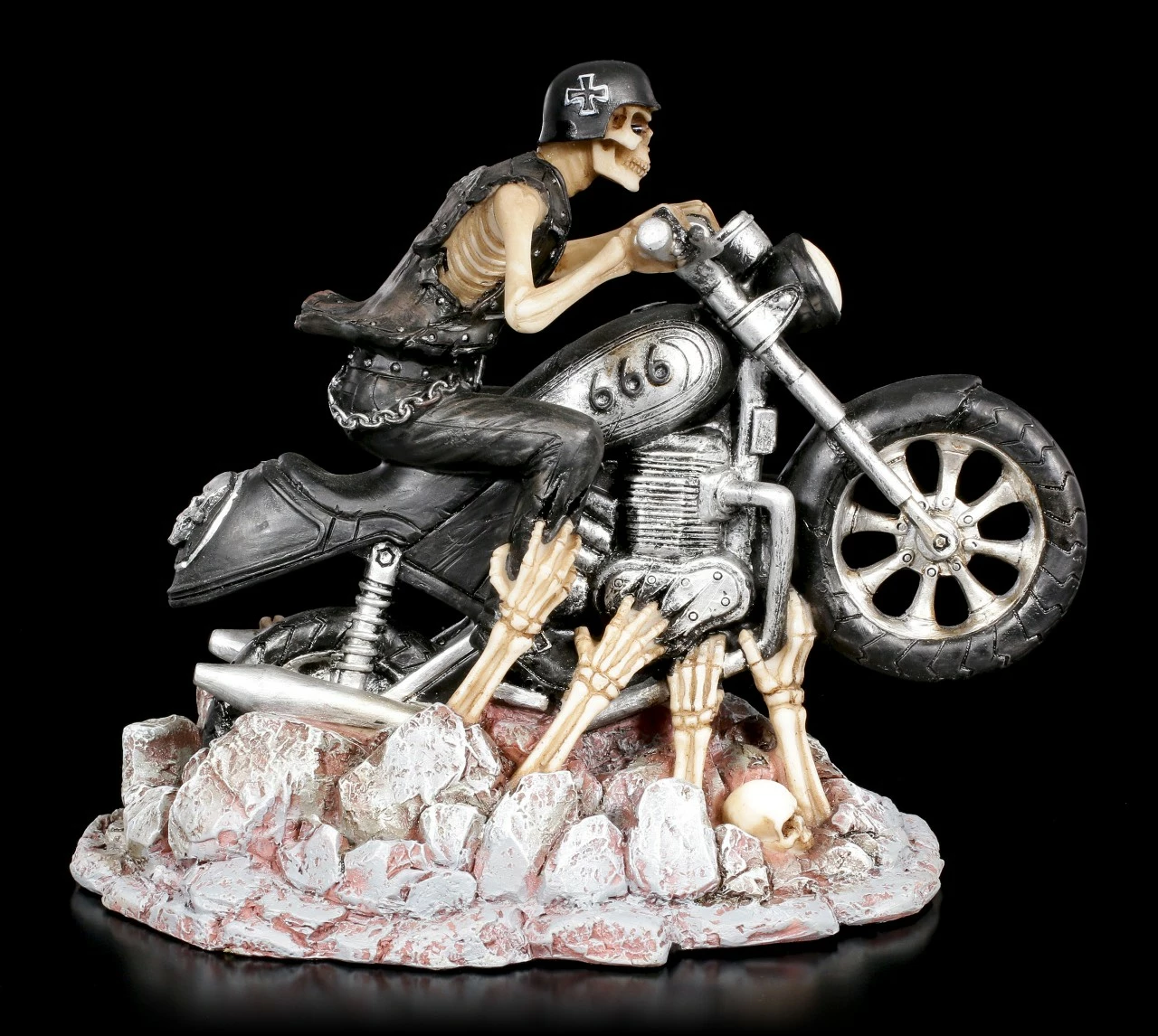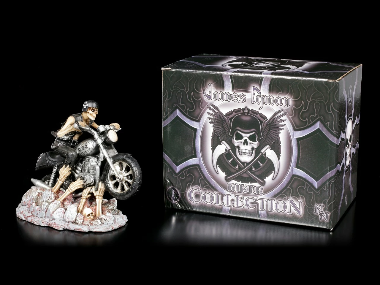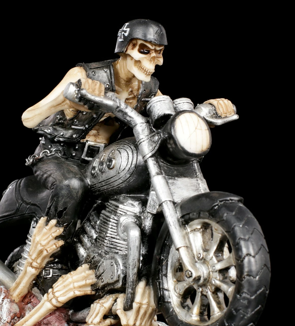 Dieses Skelett hat es geschafft. Es hat ein Motorrad gestohlen und fährt über die verlorenen Seele aus der Hölle in die große weite Welt. Die Skelett Figur von James Ryman ist ein ideales Geschenk an einen Biker.