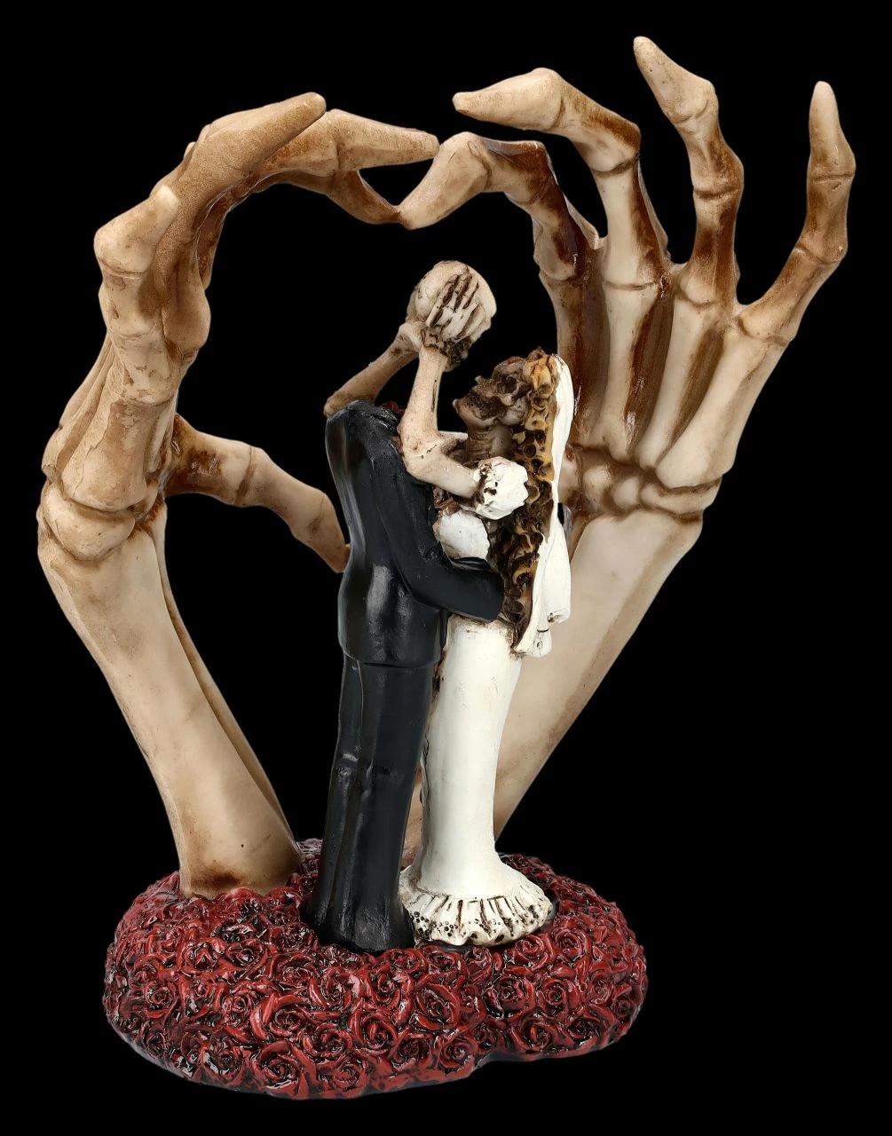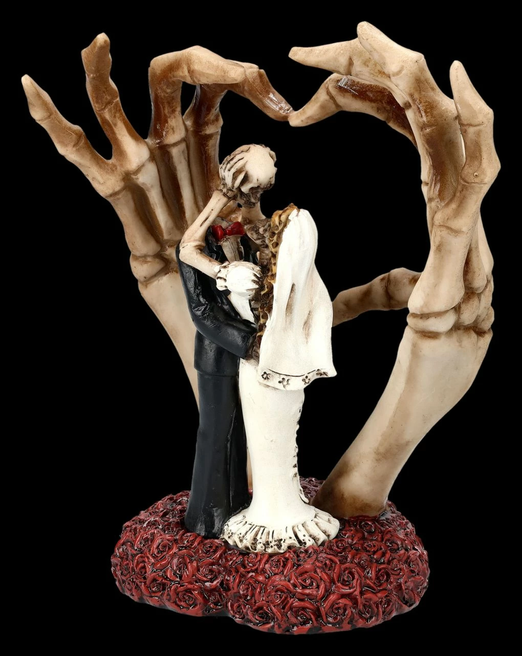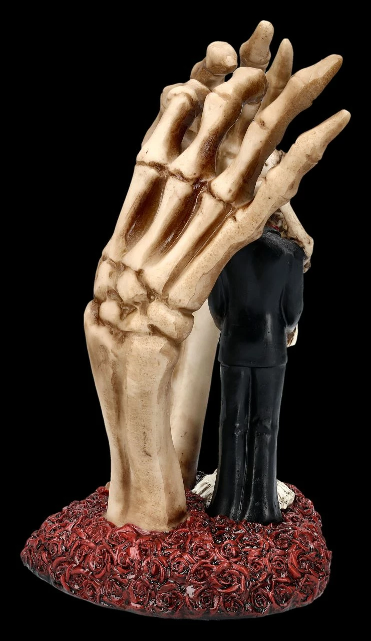 Das nennt man dann wohl ‚Kopf verloren‘ – und das über den Tod hinaus – und dann auch noch auf Rosen gebettet… Skeletthände bilden ein herzförmiges Tor über dem Skelett-Brautpaar. Die Braut hält den vom Körper getrennten Kopf ihres Bräutigams hoch erhoben in ihren Händen. ‚From This Day Forward‘ heißt diese 19,5 cm hohe, 17,5 cm breite und 11,5 cm tiefe Skelett-Figur mit dem Brautpaar. Das ist doch mal eine ganz andere Deko für einen Hochzeitstisch.
