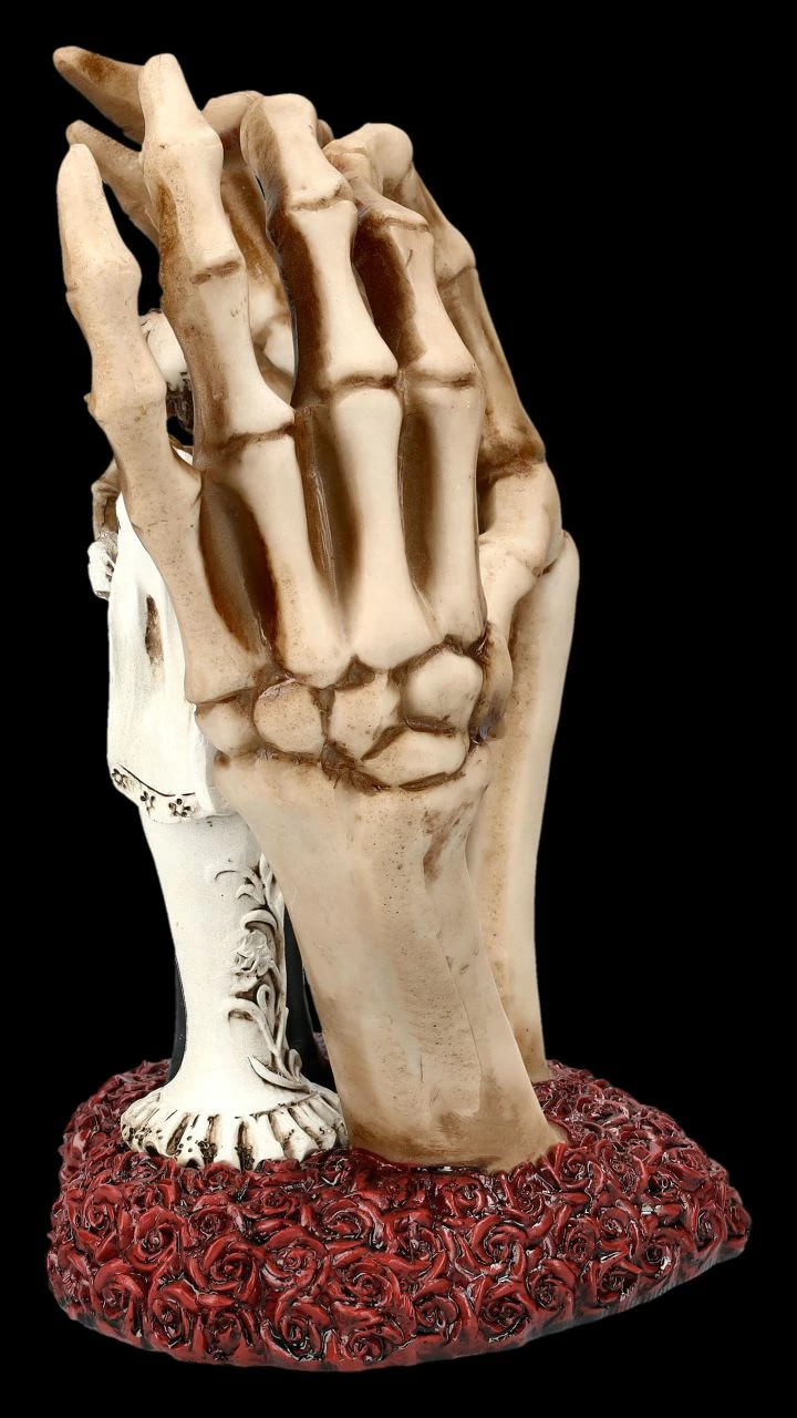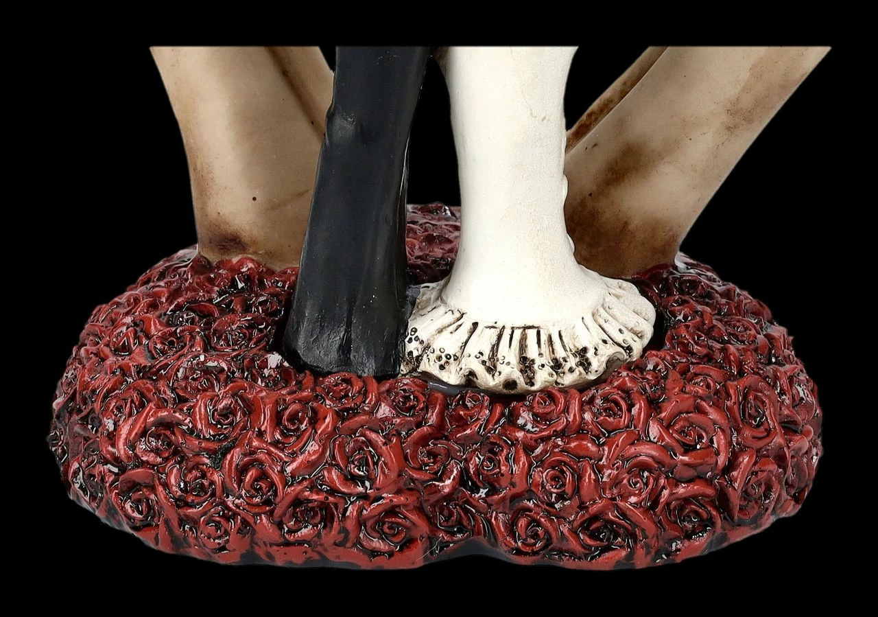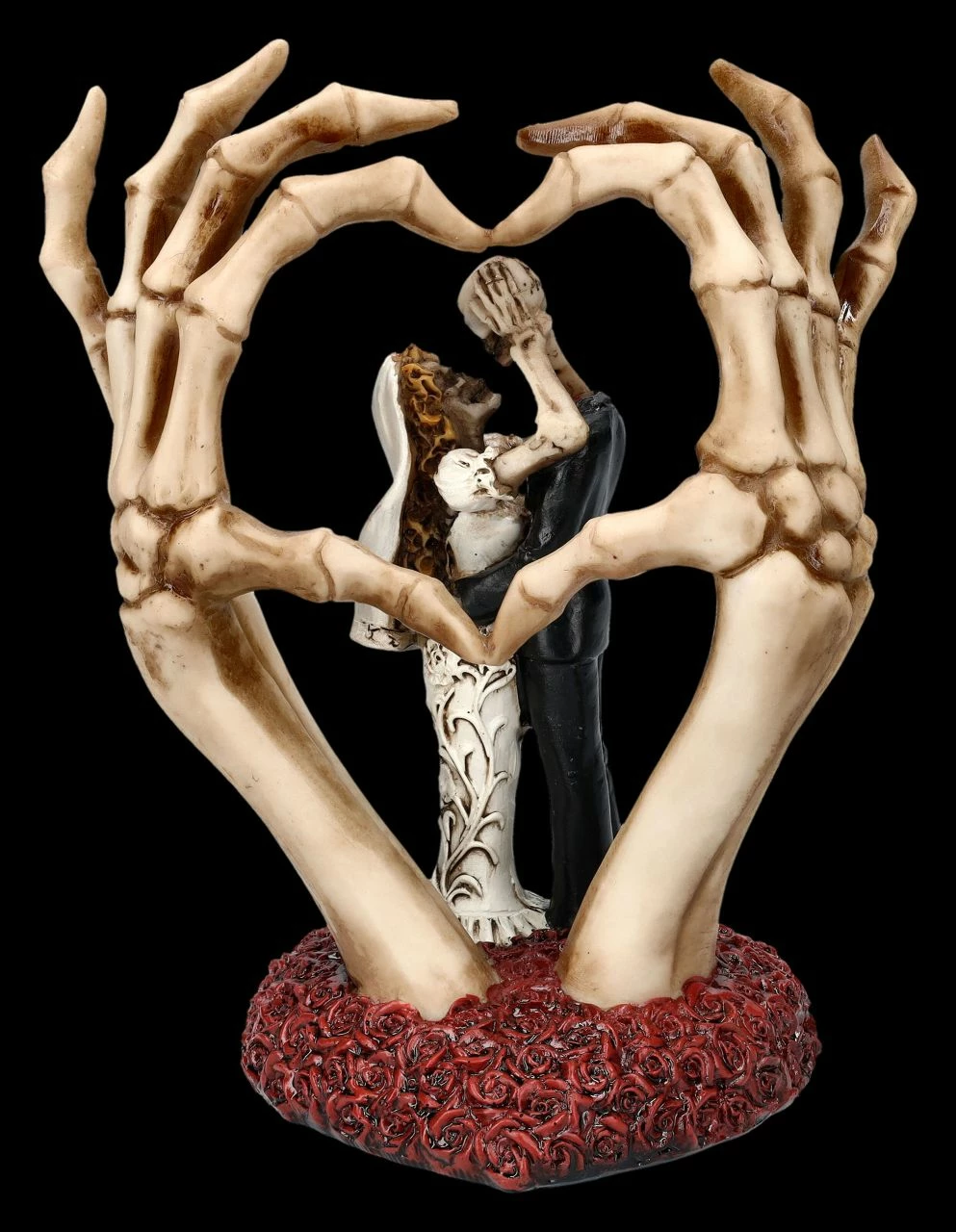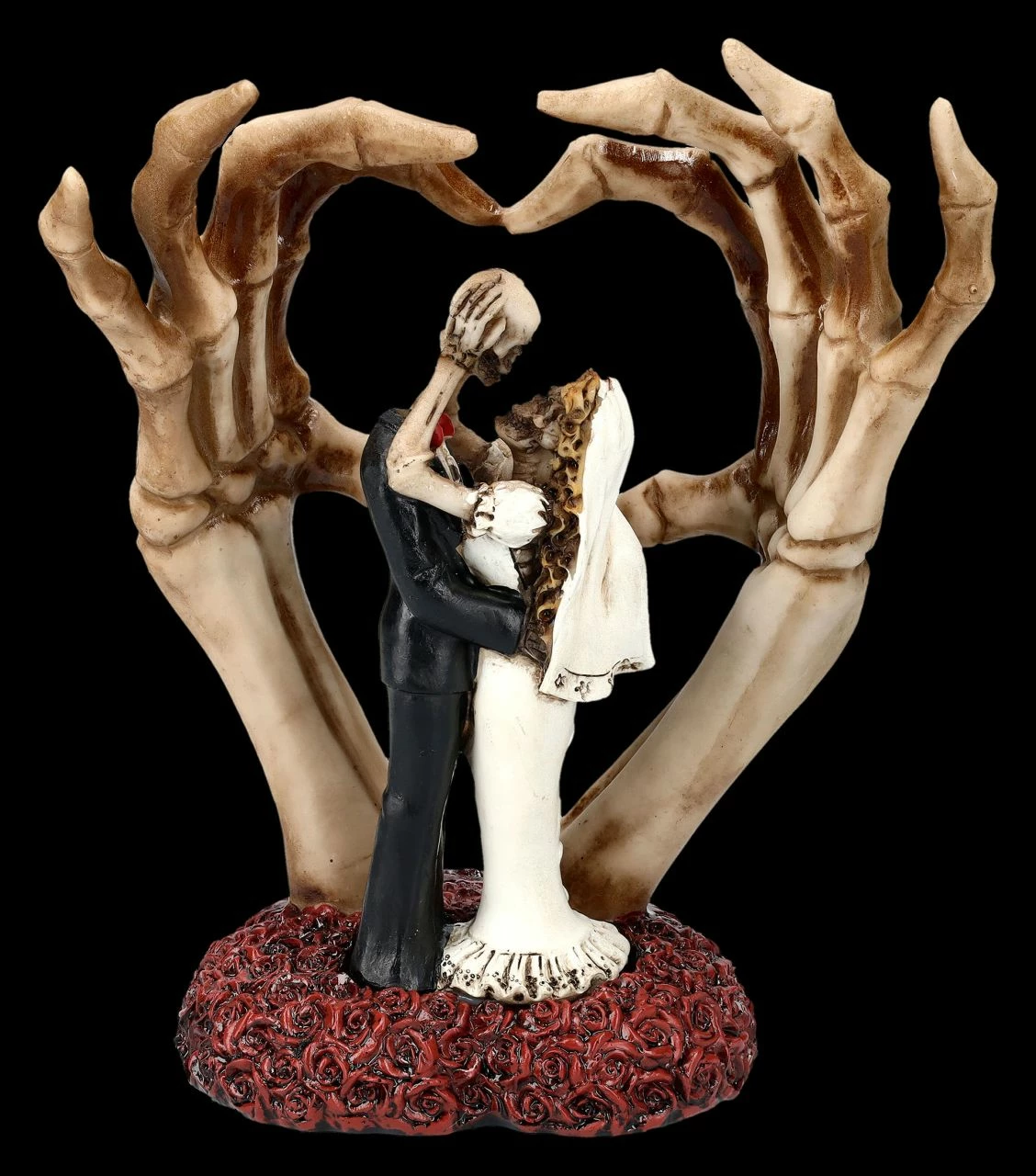 Das nennt man dann wohl ‚Kopf verloren‘ – und das über den Tod hinaus – und dann auch noch auf Rosen gebettet… Skeletthände bilden ein herzförmiges Tor über dem Skelett-Brautpaar. Die Braut hält den vom Körper getrennten Kopf ihres Bräutigams hoch erhoben in ihren Händen. ‚From This Day Forward‘ heißt diese 19,5 cm hohe, 17,5 cm breite und 11,5 cm tiefe Skelett-Figur mit dem Brautpaar. Das ist doch mal eine ganz andere Deko für einen Hochzeitstisch.