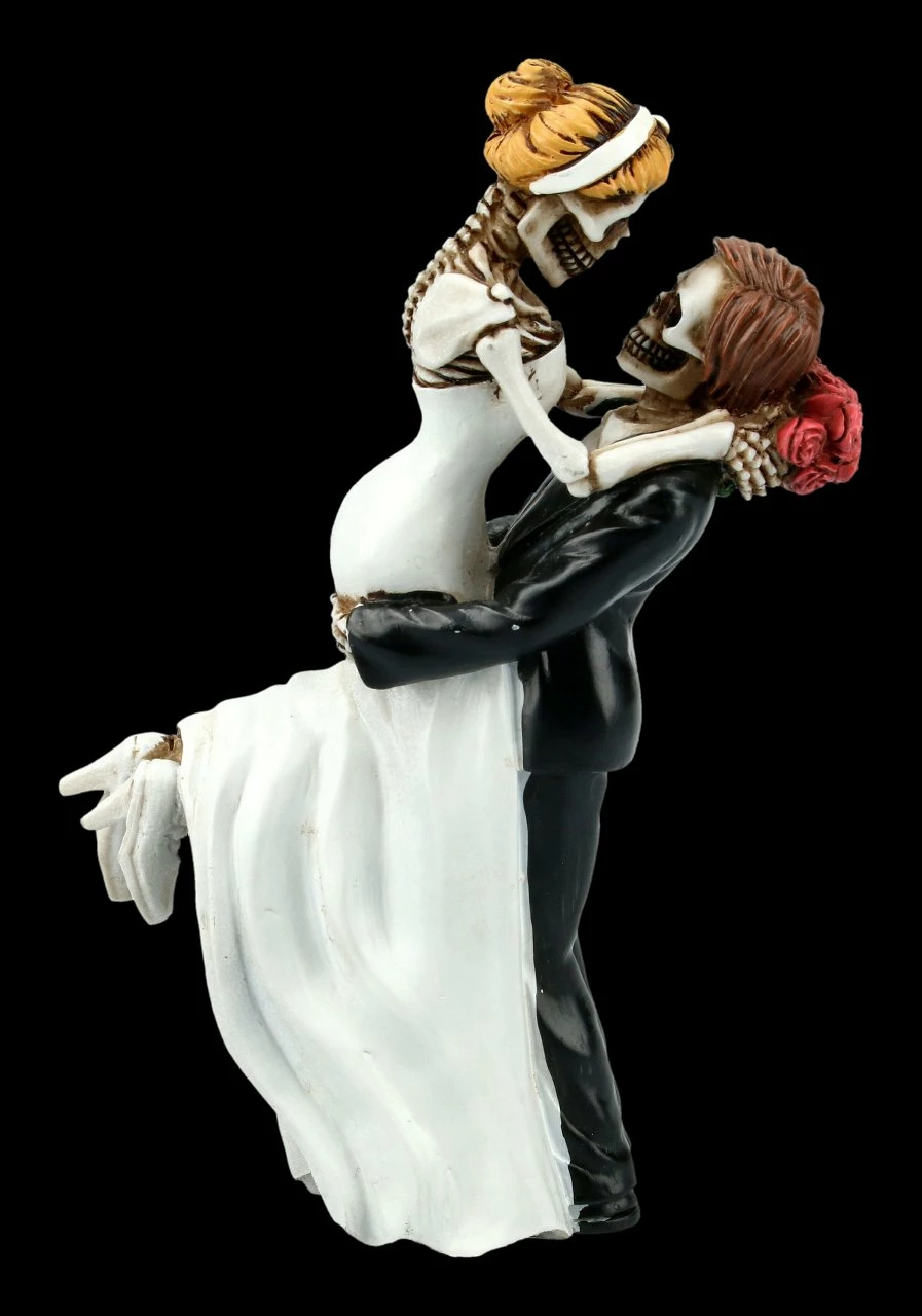 Vor Glück strahlend, hebt der Bräutigam im schwarzen chicen Smoking seine Braut im langen weißen Brautkleid hoch. Die witzige und ausgefallene Deko mit dem Skelett-Brautpaar soll zeigen, dass die Liebe bis in alle Ewigkeit dauern wird. Das liebevoll handbemalte Skelett Liebespaar ist sehr detailreich aus Kunststein (Polyresin) gefertigt und hat eine Höhe von 15,5 cm, eine Breite von 10,5 cm und eine Tiefe von 4,5 cm. Diese Hochzeitsdeko mit dem Skelett-Brautpaar Love Never Dies wird mit Sicherheit allen im Gedächtnis bleiben.