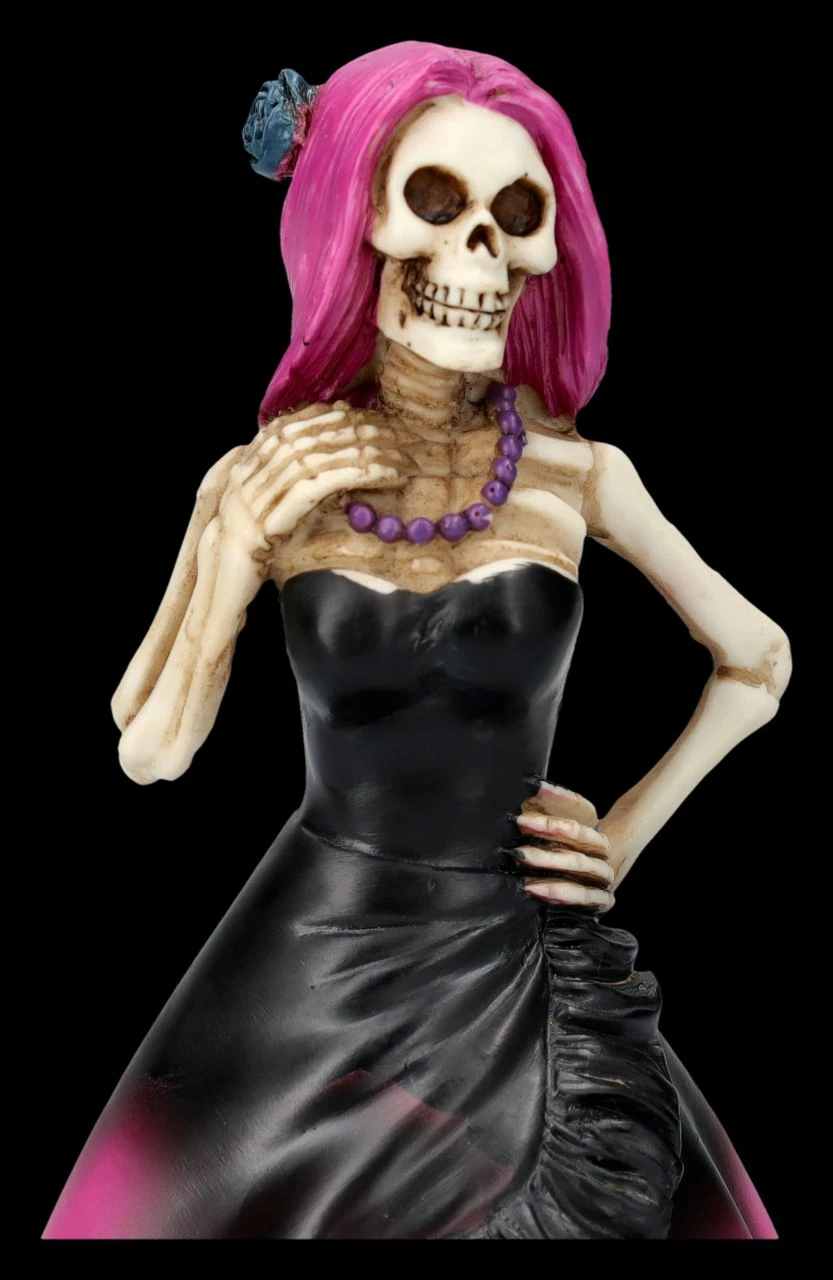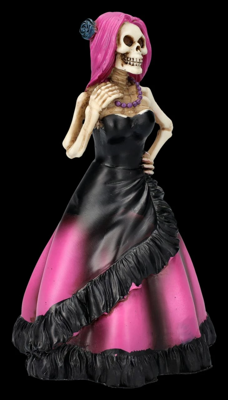 ‚Bin ich nicht wunderschön?‘, das fragt sich offensichtlich die elegante Lady in Pink. Die wunderbare Skelett-Figur in dem prachtvollen schwarz/rosa-farbenen Abendkleid mit dem schwarzen Volant ist 15,5 cm hoch, 9,5 cm breit und 9 cm tief. Sie ist detailreich aus Kunststein (Polyresin) entstanden und wurde mit viel Liebe zum Detail im ‚Day of the Dead‘-Stil von Hand bemalt. Die DOD Lady im rosa Kleid ist nicht nur eine tolle Deko zum ‚Tag der Toten‘, sondern auch ein witziges Geschenk für alle, die diesen Tag stilvoll begehen.
