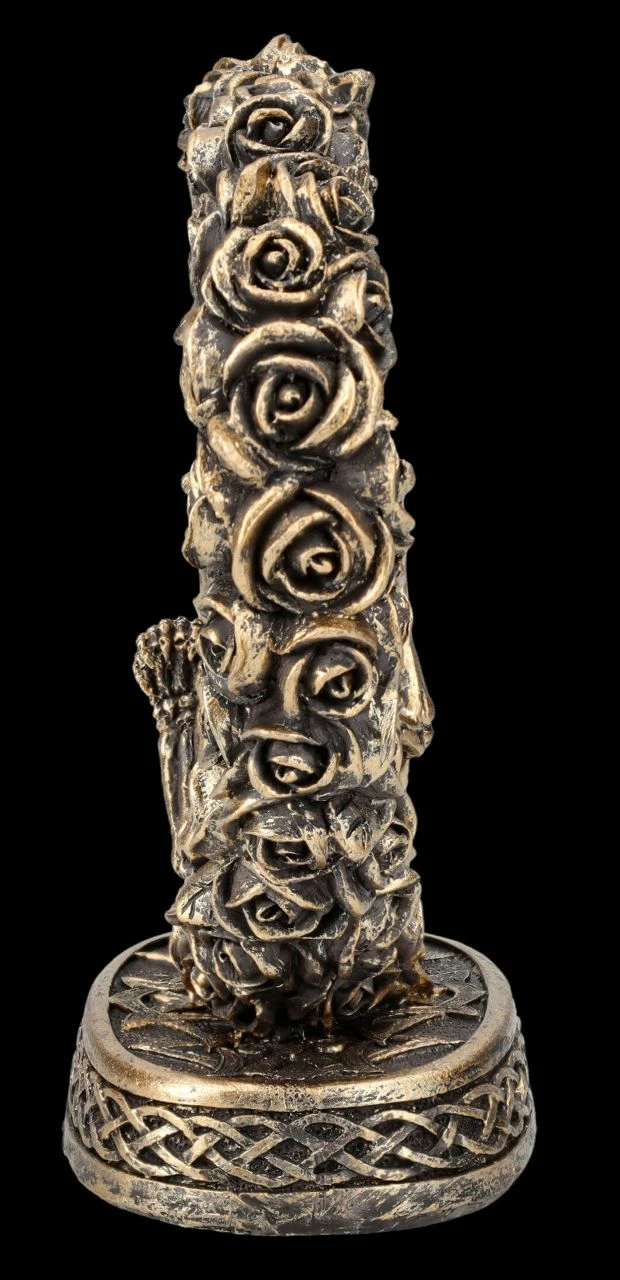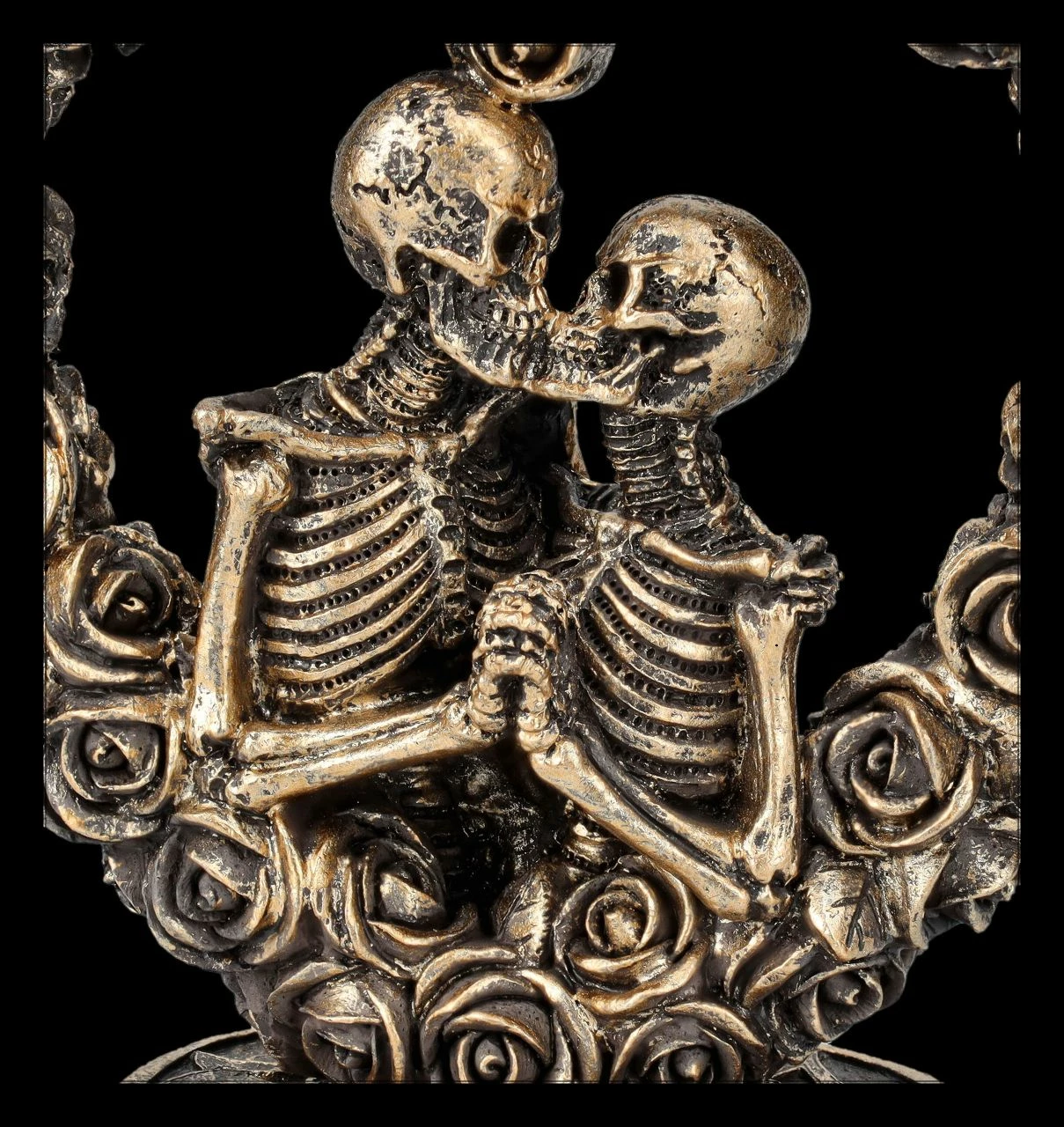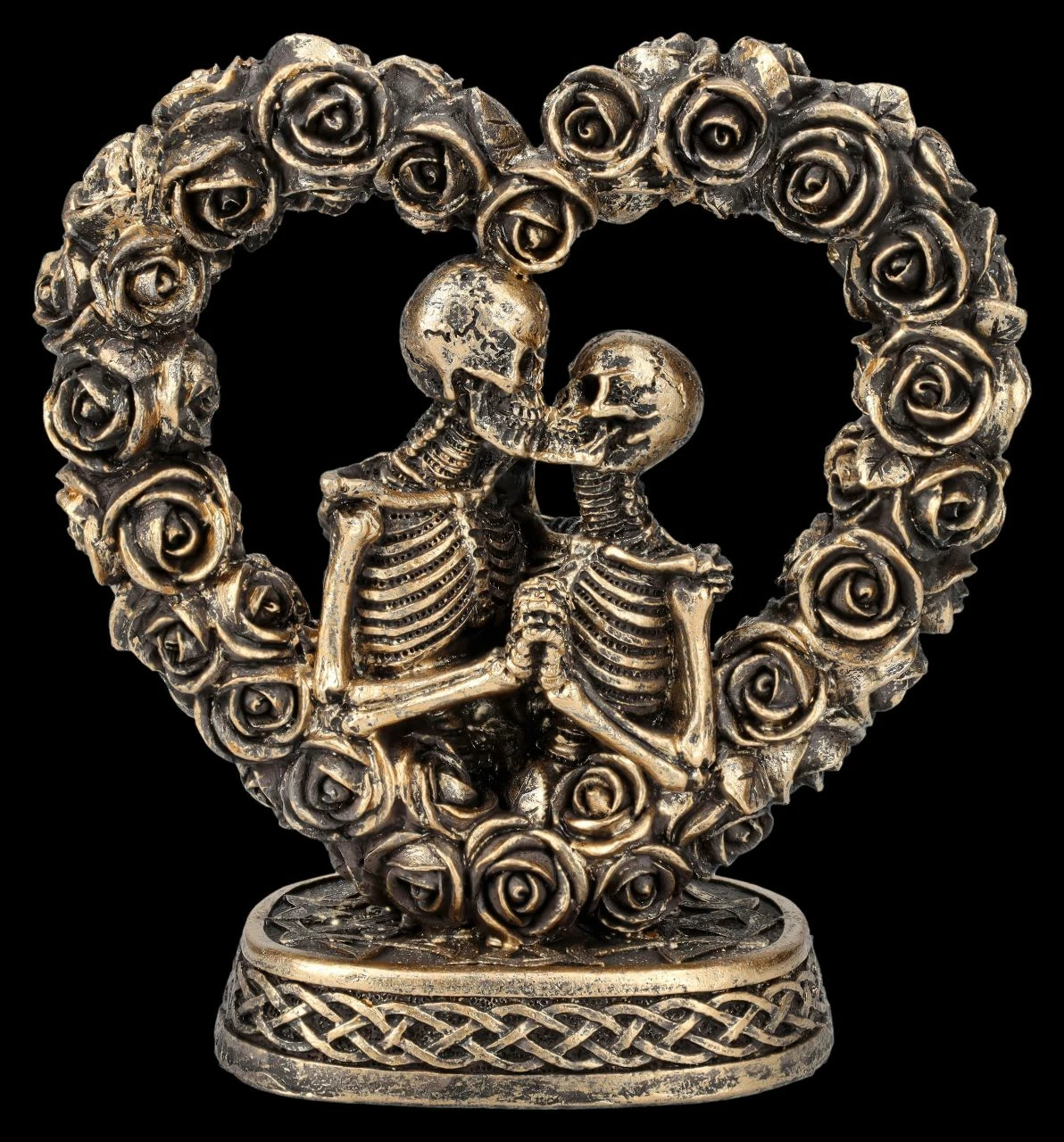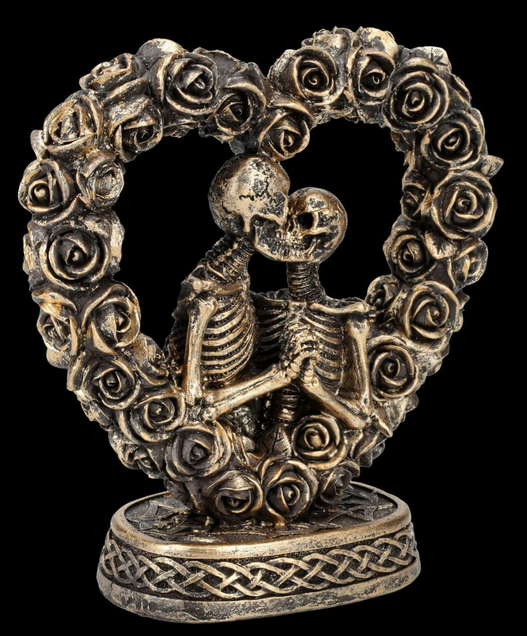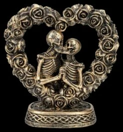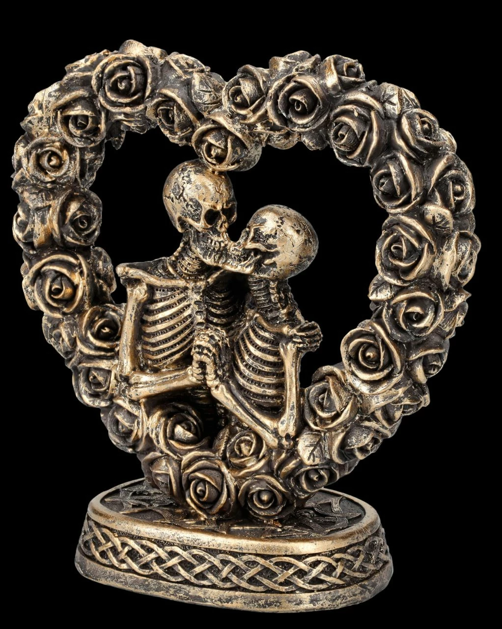 Romantik pur strahlen die beiden sich zärtlich umarmenden Skelette in dem Rosenherz aus. Es ist aus liebevoll handbemaltem Kunststein (Polyresin) und 12 cm hoch, 11,5 cm breit und 5,5 cm tief. ‚Unsere Liebe soll währen bis in alle Ewigkeit‘! Wäre das mit diesem, wie ein Schmuckstück aussehenden, bronzefarbenen Rosenherz nicht eine romantische Liebeserklärung für die Liebste oder den Liebsten? Das Skelett-Liebespaar im Rosenherz ist also ein perfektes Geschenk.