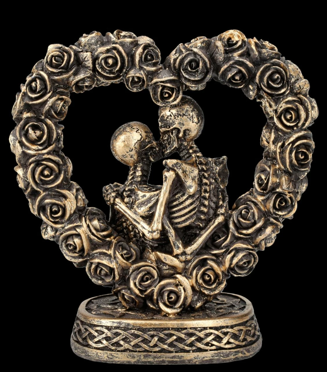 Symbolträchtige Liebe: Bronzefarbenes Rosenherz mit Skelett-Paar