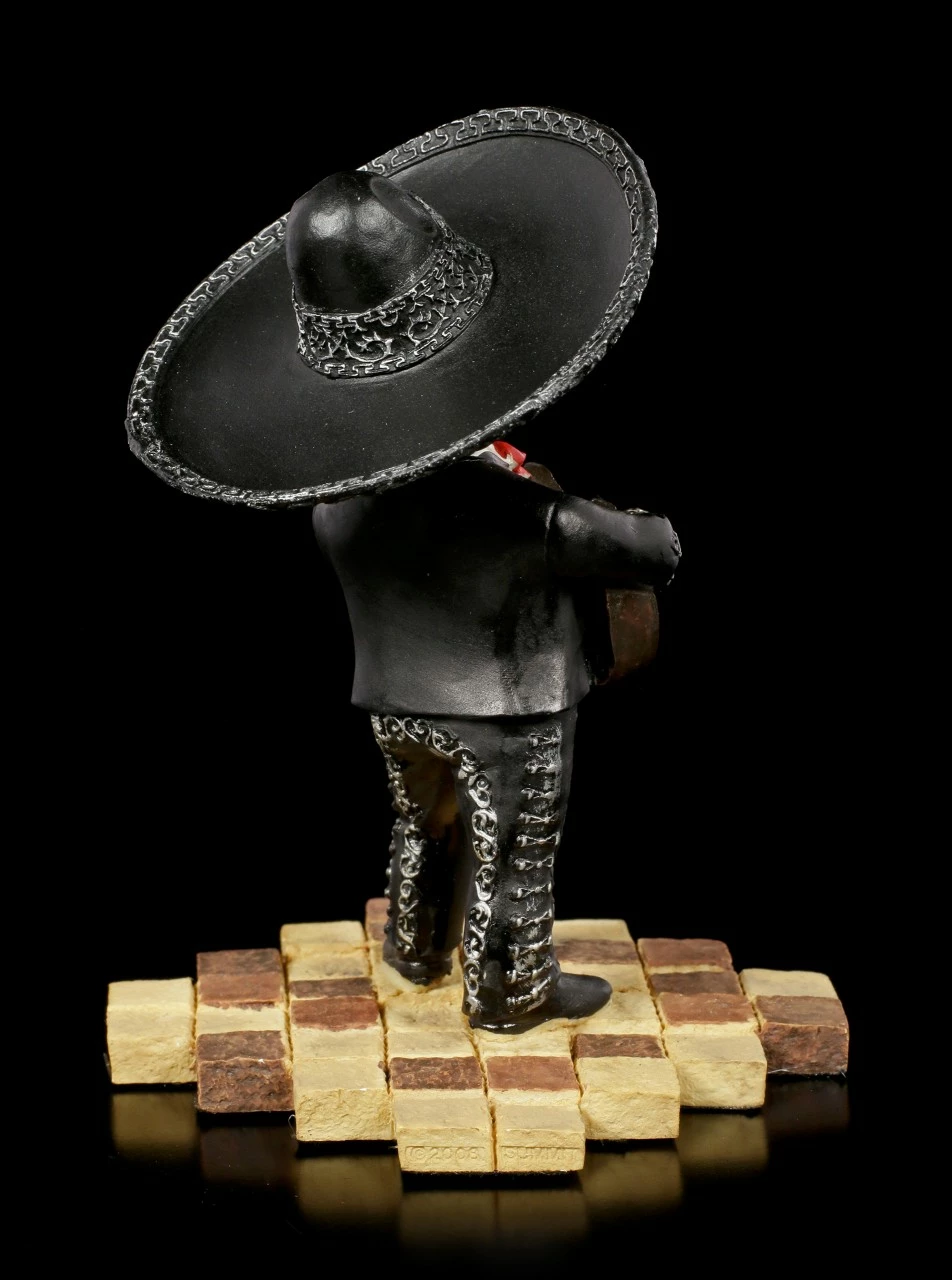 Das kleine Skelett ist ein virtuoser Gitarrist. Da er sein Instrument und das mexikanische Leben liebt, ist er einer Mariachi Band beigetreten und begeistert das Publikum mit einen Künsten. Ist die handbemalte Figur aus Kunststein (Polyresin) nicht einfach hinreißend zum Ansehen?