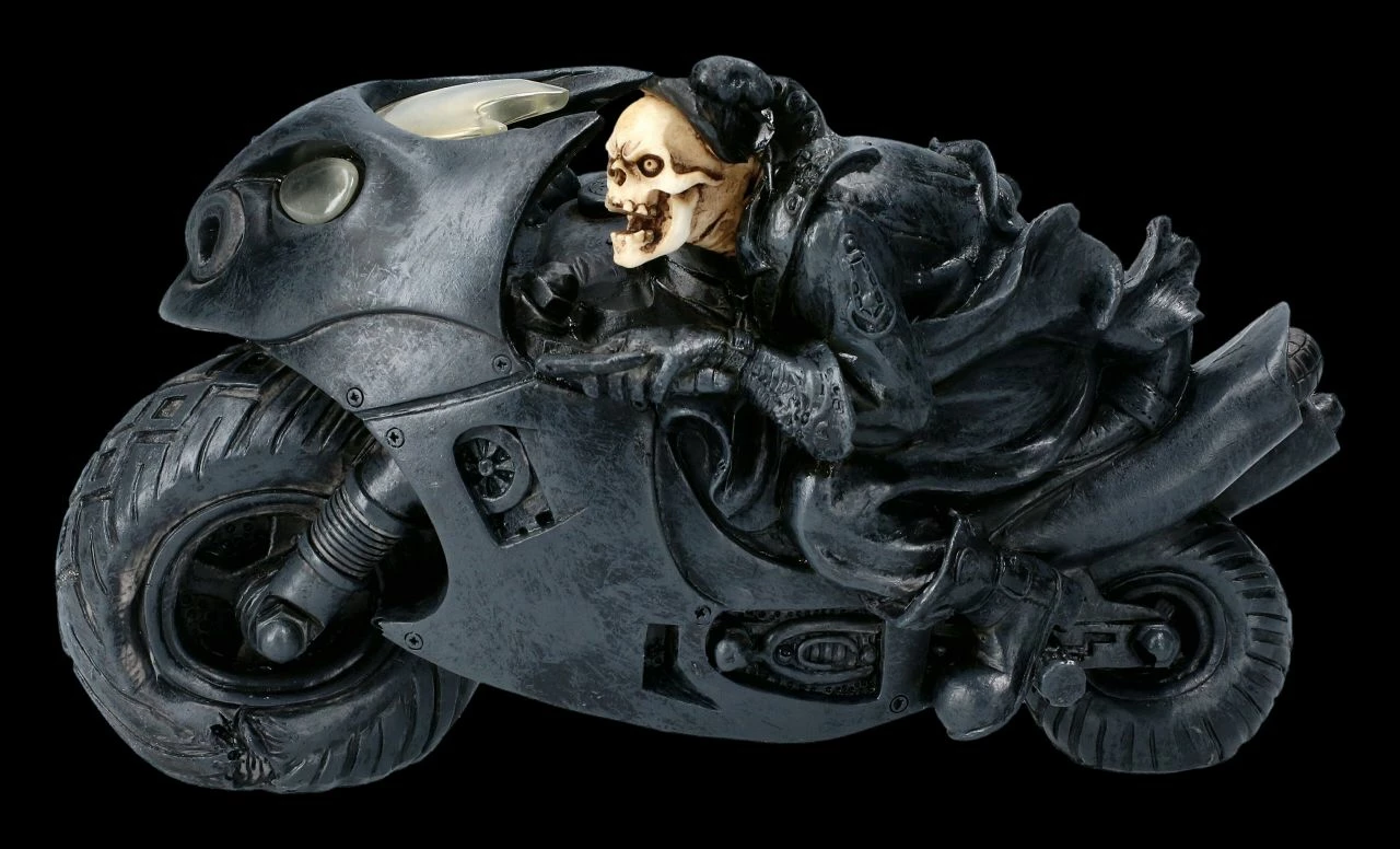 Gib Gummi – scheint das Skelett auf dem Motorrad mit großem Vergnügen zu brüllen, während es in die Kurve rast. Man kann es beinahe hören. Detailreich aus handbemaltem Kunststein (Polyresin) gefertigt, ist das 12 cm hohe, 18,5 cm breite und 10,5 cm tiefe rasende Skeltt auf dem Motorrad ein toller Blickfang. Speed Freak ist aber auch ein hammermäßiges Geschenk für jeden Biker.
