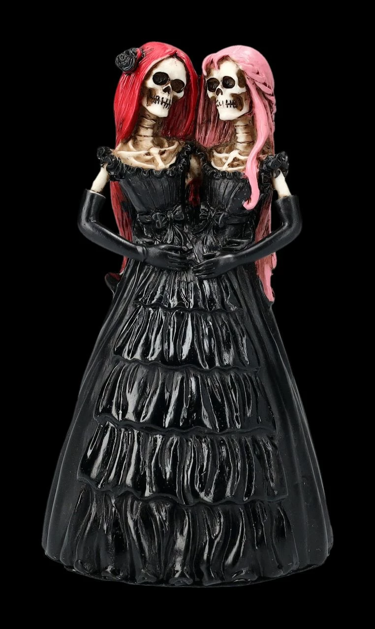 Wenn diese beiden untrennbar miteinander verbundenen siamesischen Zwillinge nicht die perfekte Deko für jede Grusel- oder Halloween-Party sind… Schließlich sind die beiden rothaarigen sexy Zwillinge in dem prunkvollen schwarzen Kleid bereits für die Party gekleidet. Die ‚Skelamesischen Zwillinge‘ wurden detailreich aus Kunststein (Polyresin) gefertigt. Die faszinierende Skelett Figur ist 12,5 cm hoch, 7,5 cm breit und 7 cm tief und wurde und von Hand bemalt.