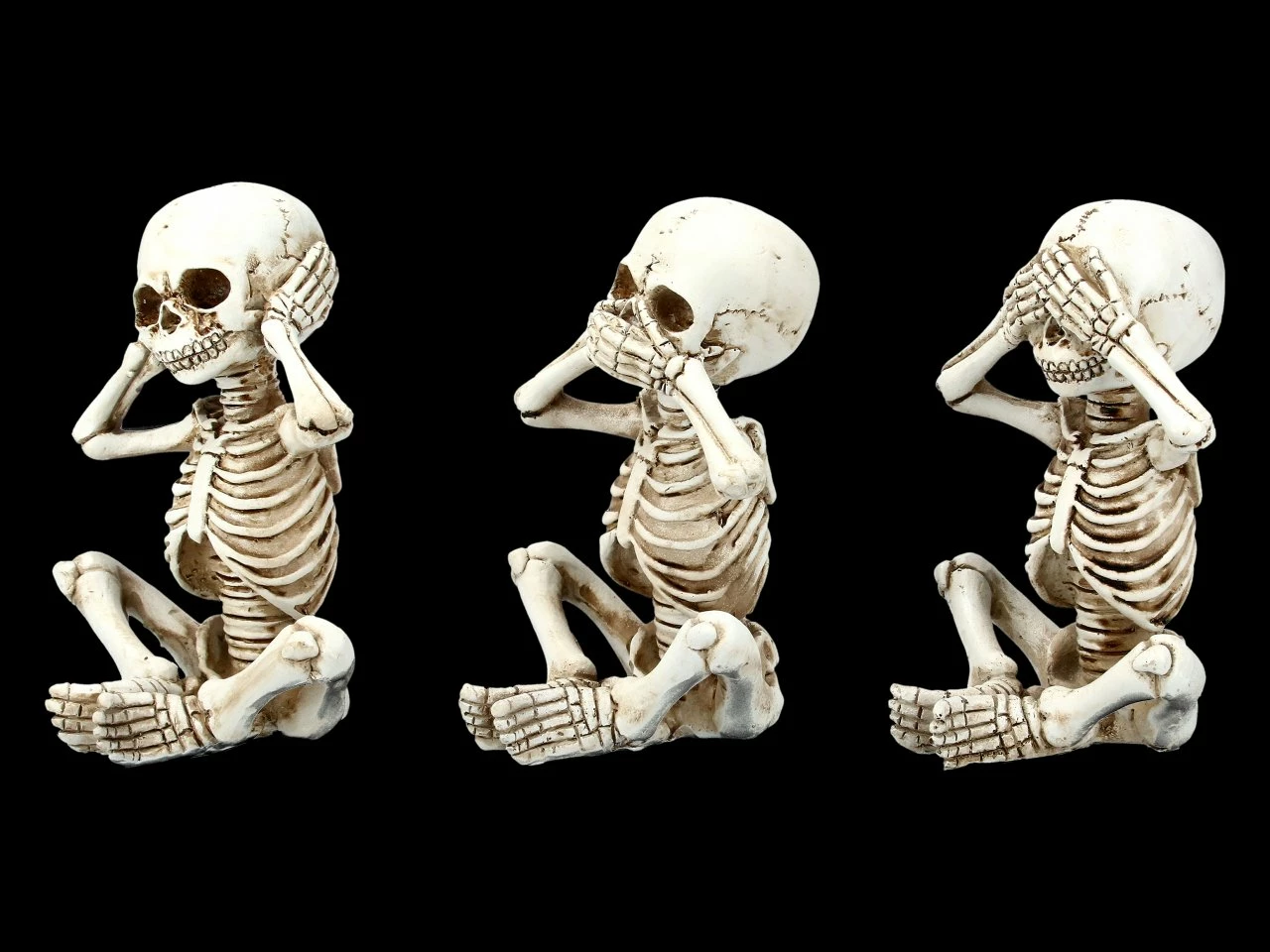 Nichts Böses hören, nichts Böses sagen und nichts Böses sehen – die drei lustigen Skelett Figuren machen es Ihnen vor. Die witzigen Skellywag Figuren im 3-er Set sind sehr detailliert aus Kunststein (Polyresin) gefertigt und realistisch in den Knochenfarben handbemalt. Sie sind je 13 cm hoch, je 10 cm breit und je 8,5 cm tief. Ob in Ihrem Arbeitsbereich oder daheim, diese drei lustigen Gesellen werden sofort alle Blicke auf sich ziehen.