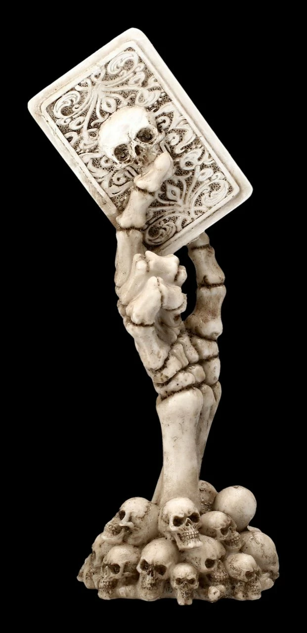 Glücksbringer am Kartentisch, oder doch die Warnung, kein Ass im Ärmel zurückzuhalten? Auf jeden Fall wird diese witzige Skelett Hand mit dem Pik Ass in der Hand der absolute Hingucker bei jedem Kartenspiel. Die aus mehreren Totenschädeln ragende Skelett Hand „Ace up your Sleeve“ ist sehr detailreich aus handbemaltem Kunststein (Polyresin) gefertigt. Sie ist 18 cm hoch, 7 cm breit und 5,5 cm tief.