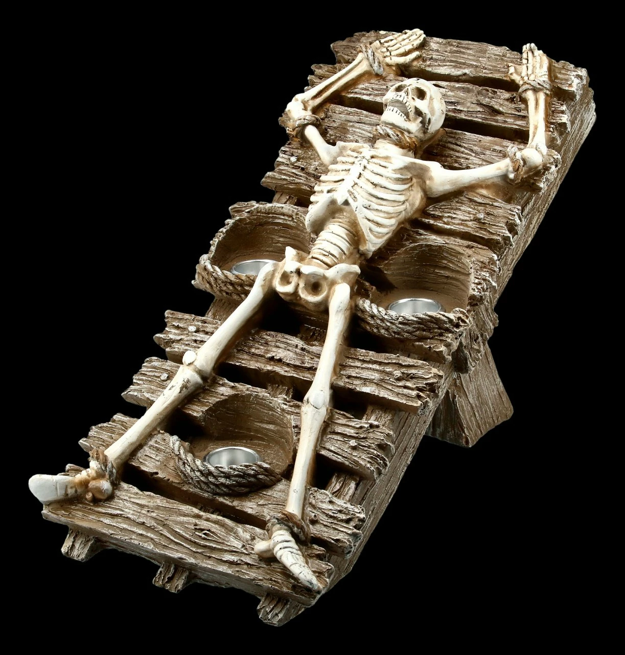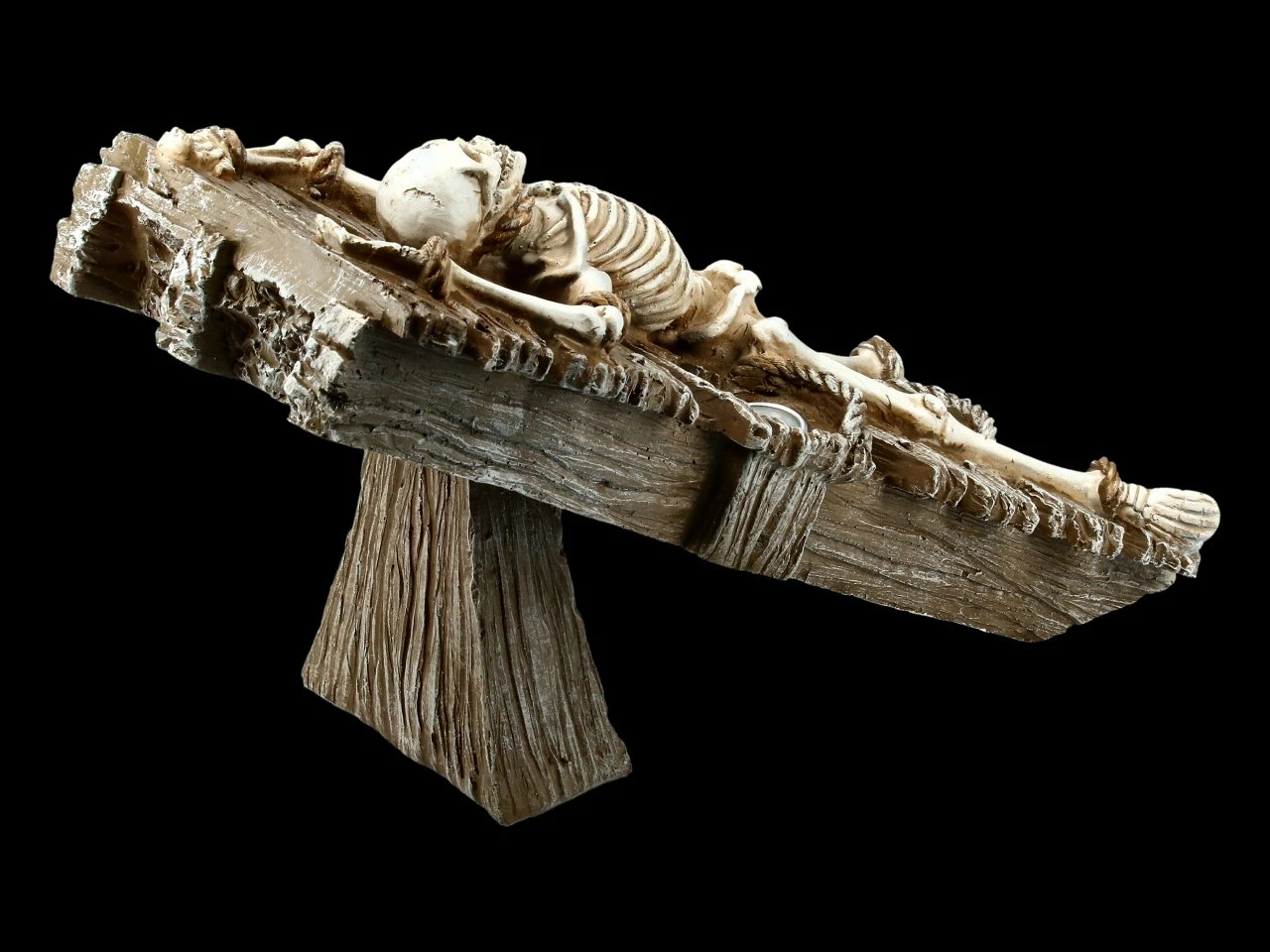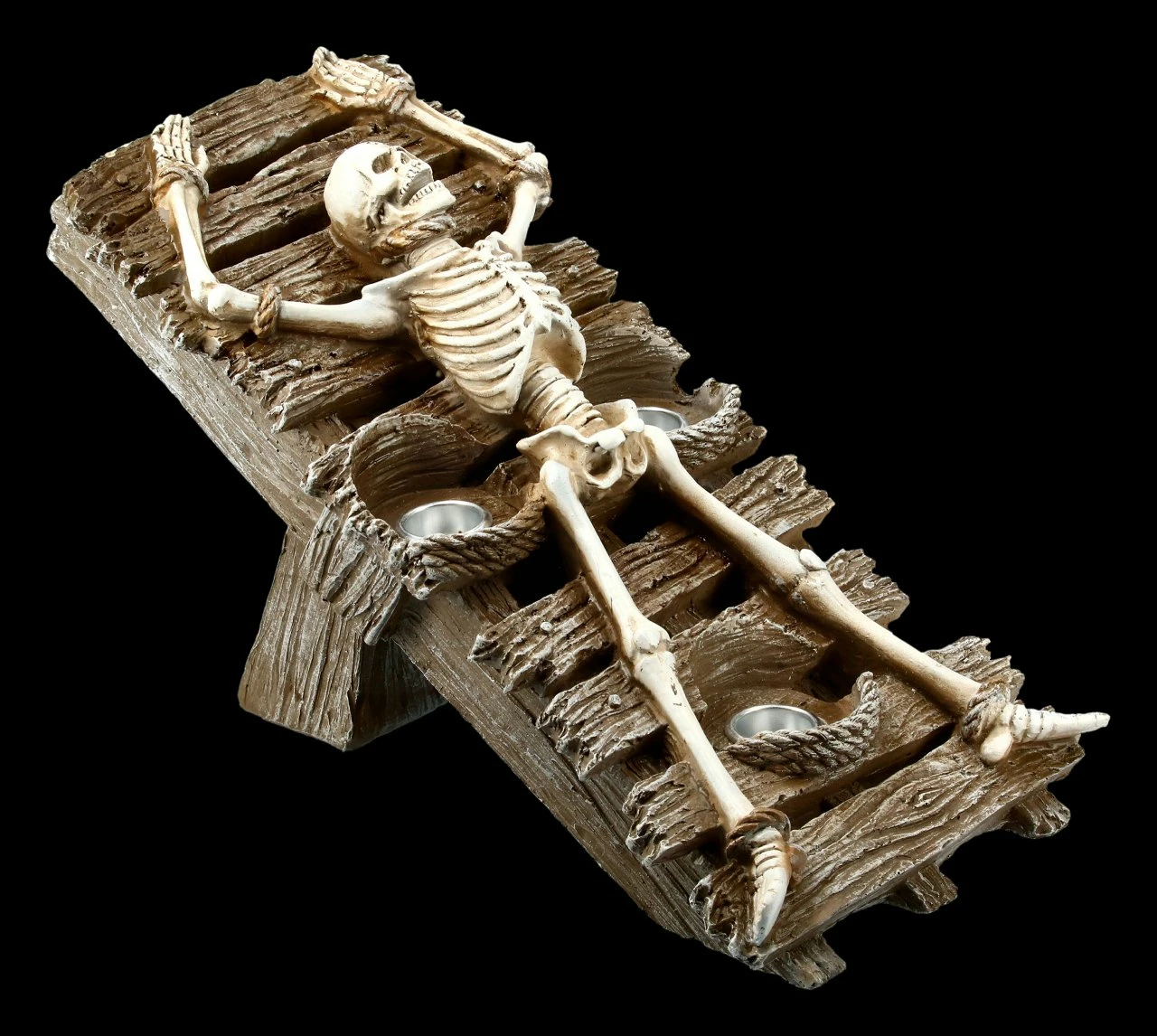 Was mag der arme Tropf wohl verbrochen haben, dass er auf der Streckbank festgebunden wurde? Ob es ein Ritual war? Denn der Platz für die 3 Kerzen lässt darauf schließen. Der außergewöhnliche, 18 cm hohe, 31 cm breite und 16,5 cm tiefe Kerzenhalter aus handbemaltem Kunststein (Polyresin) wird Sie begeistern.