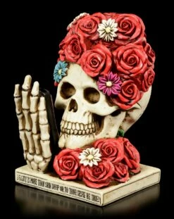 Das Skelett liebt es Selfies von sich zu machen. Dabei hat es sich mit wunderschönen roten Rosen geschmückt und zeigt, dass wahre Schönheit nie verblasst und von innen kommt.