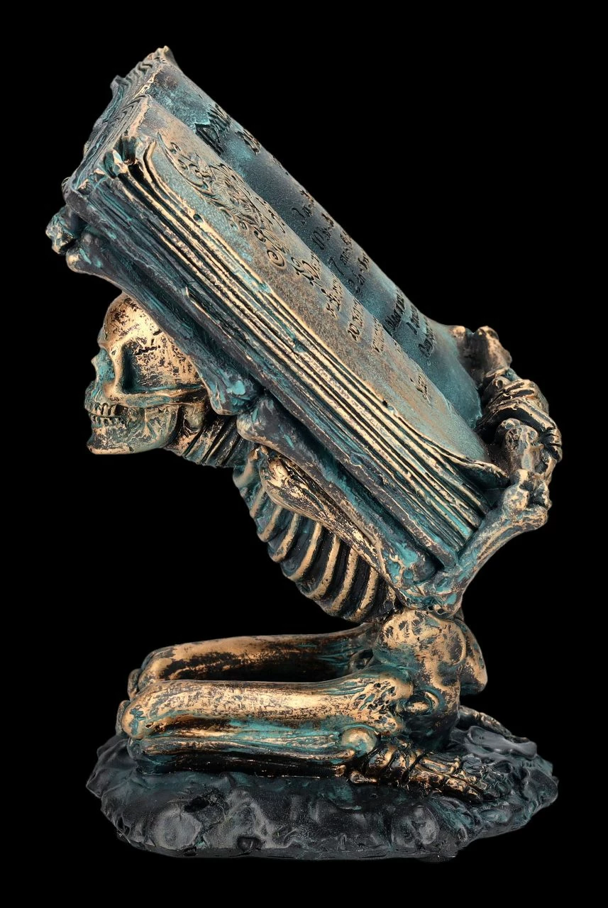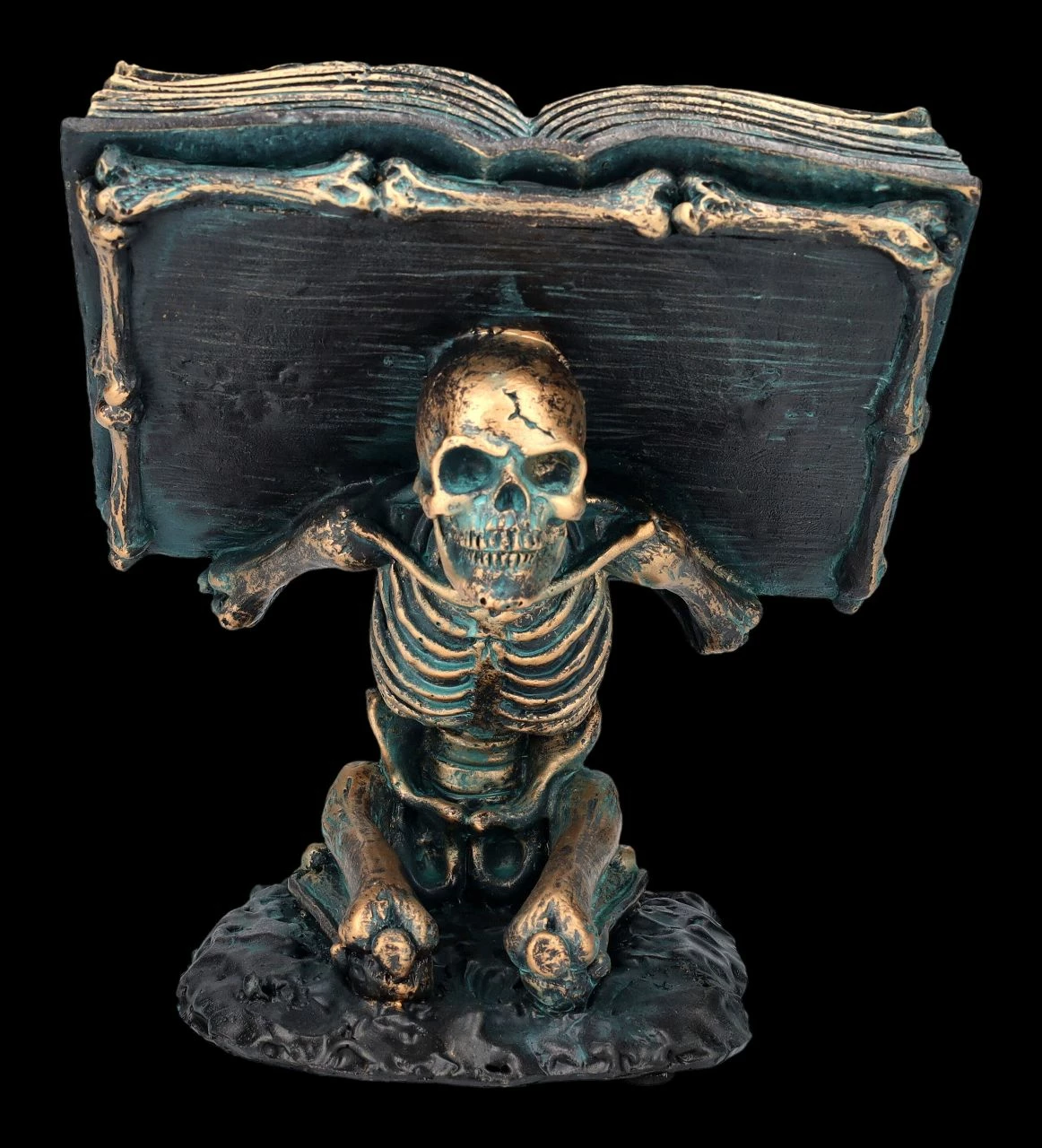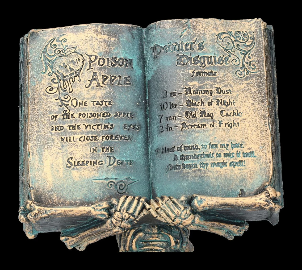Hat er das Rezept aus dem Zauberbuch ausprobiert und den vergifteten Apfel selbst gegessen? Oder warum muss er nun als Skelett dem Magier dienen und für immer und ewig das Zauberbuch halten? Die 17,5 cm hohe, 15 cm breite und 11,5 cm tiefe lustige Skelettfigur mit dem Zauberbuch wurde detailreich aus handbemaltem Kunststein (Polyresin) gefertigt. Sie ist aber auch ein witziges Geschenk als Warnung, was bei magischen Ritualen alles schief laufen kann.