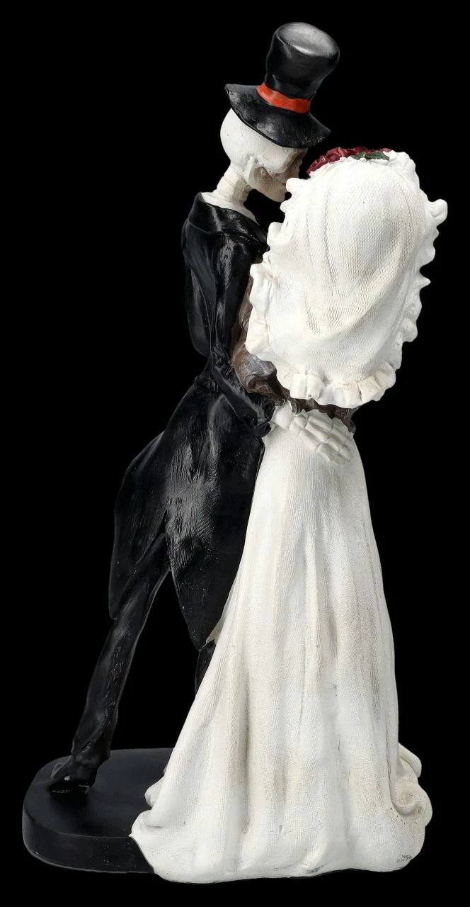 Nicht mal der Tod kann die Erinnerung an den ersten Hochzeitstanz löschen… Sie im weißen Brautkleid mit rotem Blütenkranz und einem Brautstrauß aus blutroten Rosen und er im Smoking mit Zylinder tanzen innig den Hochzeitstanz. Das lustige Hochzeitspaar wurde aus handbemaltem Kunststein (Polyresin) gefertigt. Die 33,5 cm hohe, 20 cm breite und 12 cm tiefe Skelettfigur ist nicht nur ein vielsagendes Geschenk für ein Brautpaar, sondern auch eine ungewöhnliche und humorvolle Deko für die Hochzeitstafel.