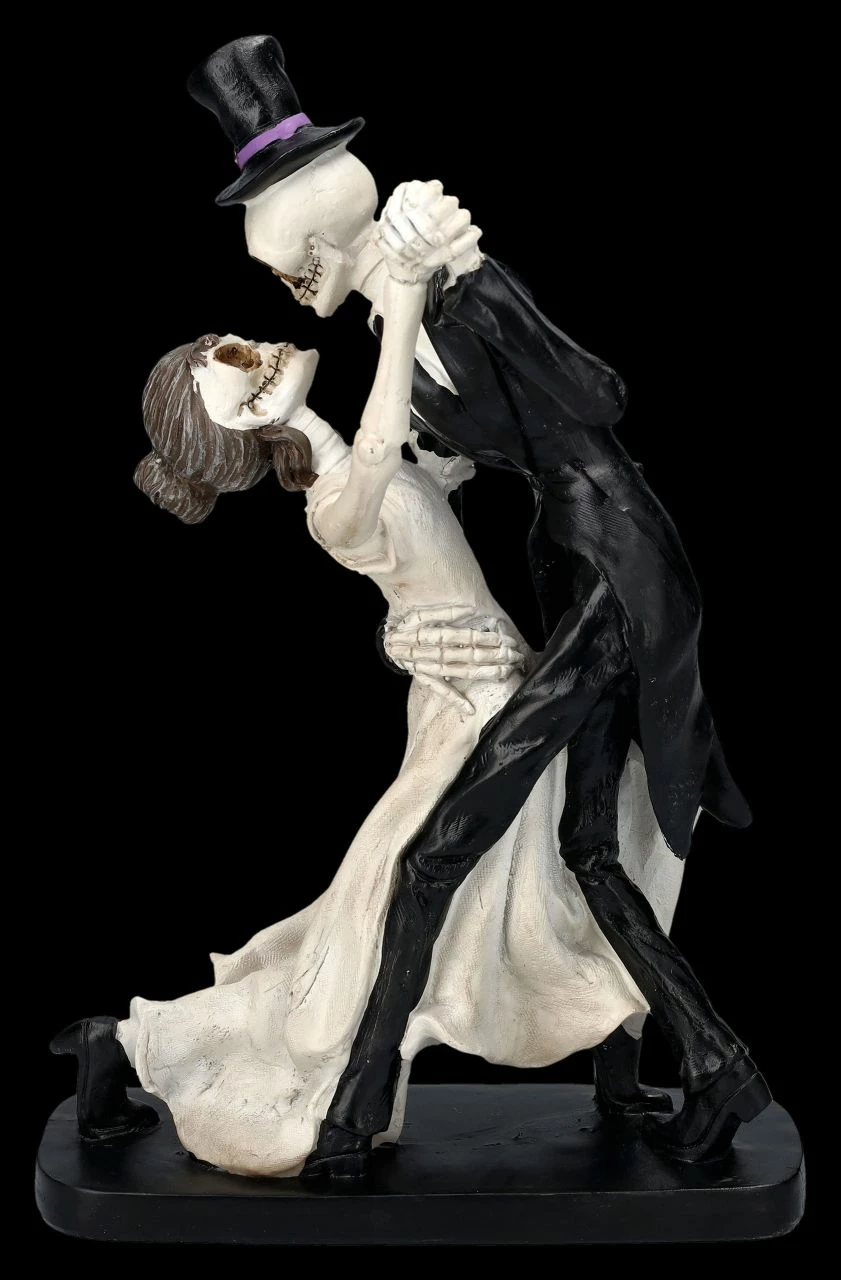 Für immer und ewig bleibt so die Erinnerung an den Hochzeitstanz erhalten. Sie im weißen Brautkleid und er im Smoking mit Zylinder – das schwungvoll tanzende Skelett-Brautpaar lädt zum Mittanzen ein. Aus handbemaltem Kunststein (Polyresin) gefertigt, ist diese 31 cm hohe, 20 cm breite und 12 cm tiefe Skelettfigur ein vielsagendes Geschenk für ein Brautpaar – vor allem, wenn sie leidenschaftlich gerne tanzen. Das tanzende Skelett-Brautpaar ist aber auch als ungewöhnliche und humorvolle Deko auf der Hochzeitstafel geeignet.