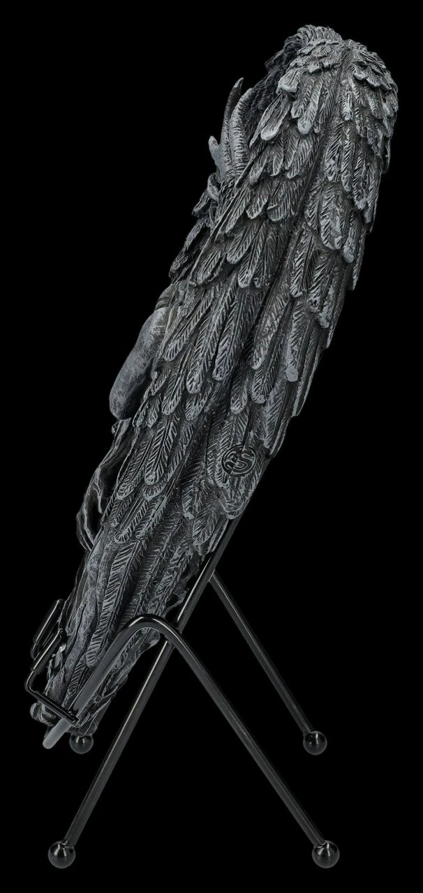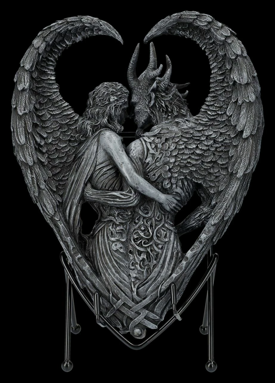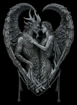 ‚Gegensätze ziehen sich an‘ – so könnte man dieses fantasievolle Deko-Relief ‚Solemn Vow‘ mit dem Dämonen und dem Engel von Spiral auch bezeichnen. Aber wer sagt denn, dass ein Dämon nicht auch zärtliche Gefühle haben kann und ein Engel eine dunkle Seite? Außerdem: Zeigt der Dämon mit den Hörnern und den Verästelungen auf seinem durchtrainierten Körper nicht auch seine Verbindung zur Natur – warum soll dann nicht eine Verbindung mit einem schönen Engel möglich sein? ‚Solemn Vow‘ – also ein ‚Feierliches Gelübde‘ legen die beiden so konträren Figuren bei Spiral ab. Die großen Flügel bilden bei diesem Relief ein Herz, das die beiden verbindet. Das ungewöhnliche Deko-Relief aus sorgsam handbemaltem Kunststein (Polyresin) ist 23 cm hoch, 18 cm breit und 4 cm tief. Mit dem in der Lieferung enthaltenen Ständer aus Metall kann das Deko-Relief mit dem Dämonen und dem Engel aufgestellt werden und ist 10 cm tief. ‚Solemn Vow‘ ist nicht nur ungewöhnlich und dekorativ, sondern auch ein vielsagendes Geschenk.