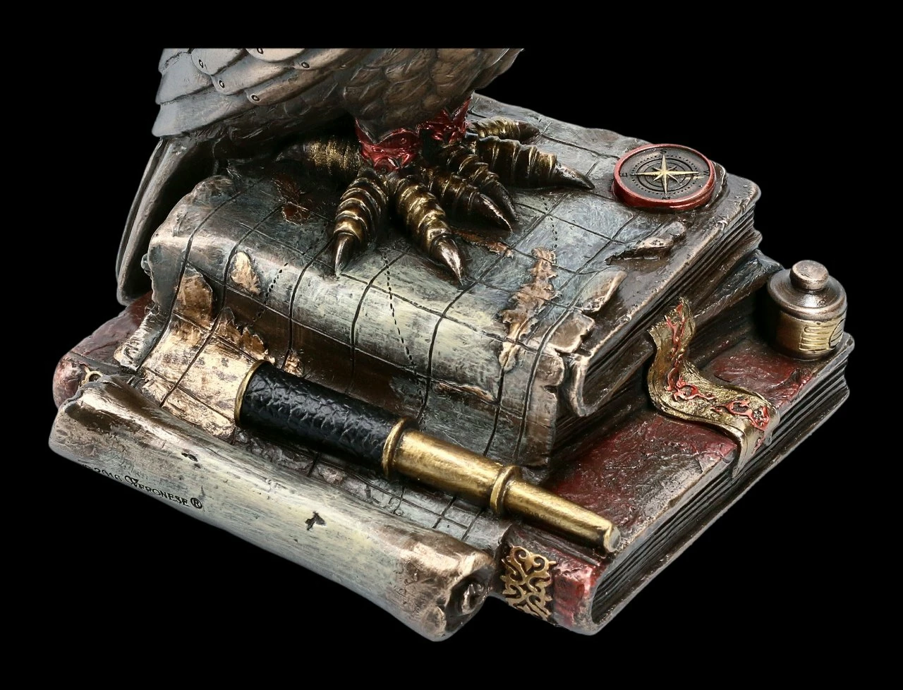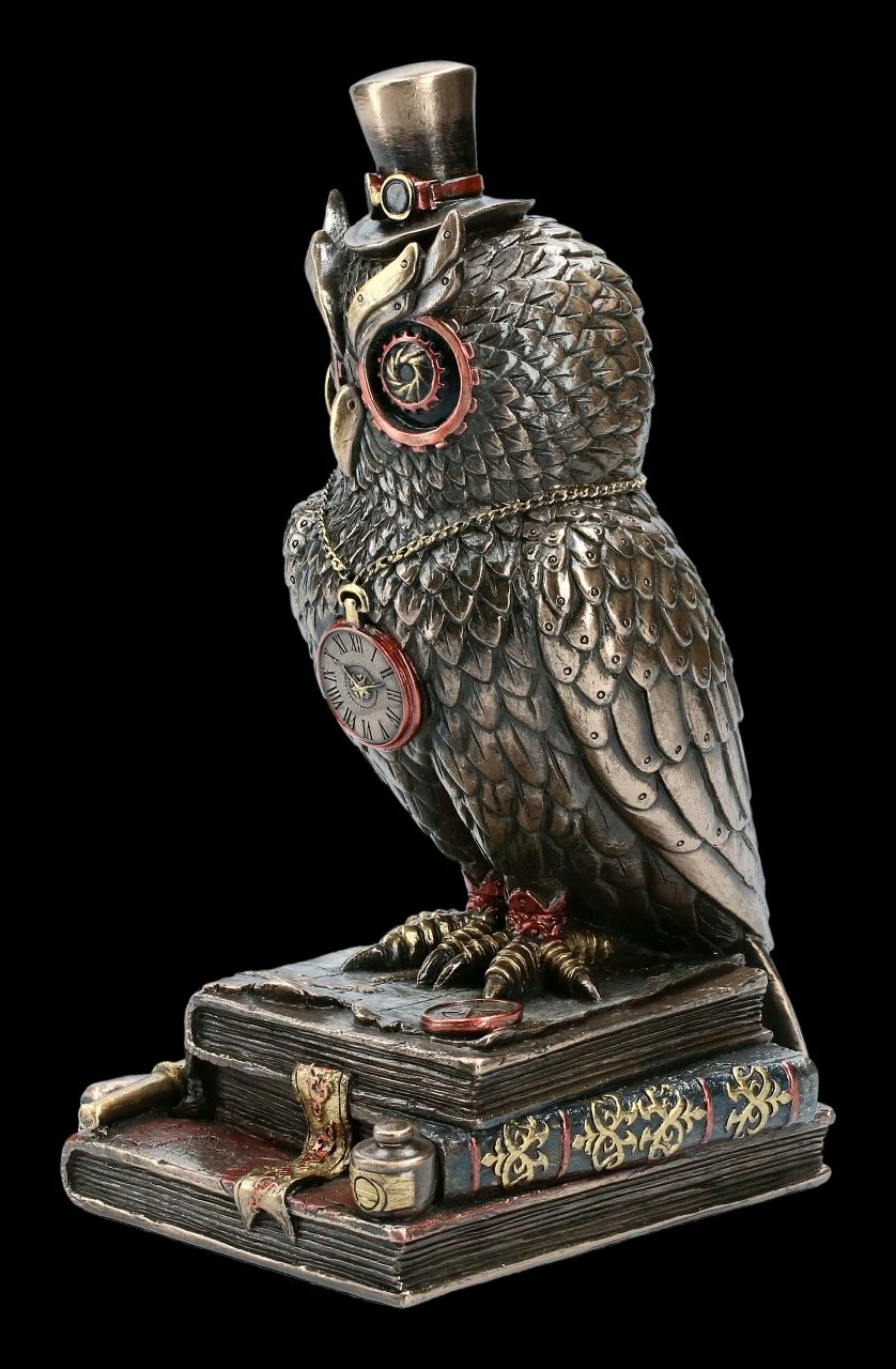 Eine Bronzefarbene Eule sitzt auf einem Stapel Bücher und Landkarten. Zu ihren Füßen liegt auch ein Fernrohr. Die Eule ist ganz nach Steampunk Art geschaffen. Sie trägt einen Zylinder und hat Zahnräder als Augen. Das Monokel darf natürlich auch nicht fehlen. Um ihren Hals hängt die obligatorische Kettenuhr. Viele kleine Steampunk Details lassen das Auge erfreuen. Die Eule vermittelt den Wunsch des Steampunk, nach Wissenschaft, Technik und Fortschritt.
