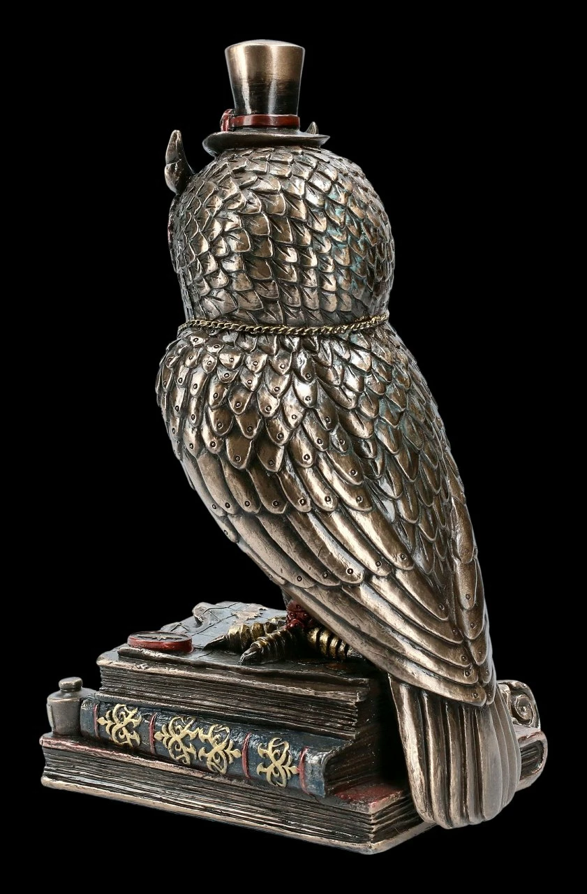 Die Steampunk Kollektion bietet eine interessante Abwechslung vom tristen, monotonen Alltag. Sie verbindet gekonnt einerseits futuristische Funktionen mit Materialien des viktorianischen Zeitalters. Dieser Retro-Futurismus hebt sich deutlich von der Alltagssituation ab und lässt die Gedanken an eine Zukunft wandern wie sie in früheren Zeiten erdacht worden ist. Die Steampunk Figur „Eule Wissendurst“ symbolisiert diese Epoche. Sie stammt aus der Studio Collection Serie vom bekannten Hersteller Veronese und wurde aus hochwertigem Kunststein geschaffen, das anschließend bronziert und coloriert wurde.