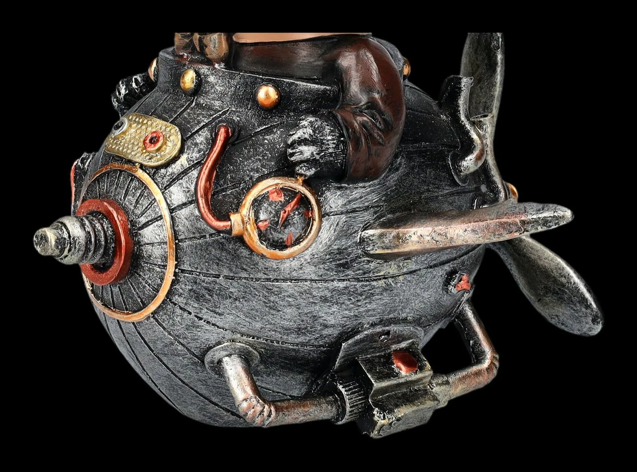 Cool, welches fantastische Gefährt hat die Katze da erfunden? Zumindest schaut es einem bewaffneten U-Boot ähnlich, aus dem die schwarze Steampunk Katze mit dem Zylinder stolz hervorschaut. Feline Invention ist mit den zahlreichen technischen Details eine tolle Deko für alle Steampunk-Fans. Die fantasievolle und detailreiche Figur aus handbemaltem Kunststein (Polyresin) ist 14,5 cm hoch, 12,5 cm breit und 12,5 cm tief. Ob für Steampunk-Fans oder auch für alle, die von der Genialität ihrer Katze überzeugt sind, ist das doch ein fantastisches Geschenk.