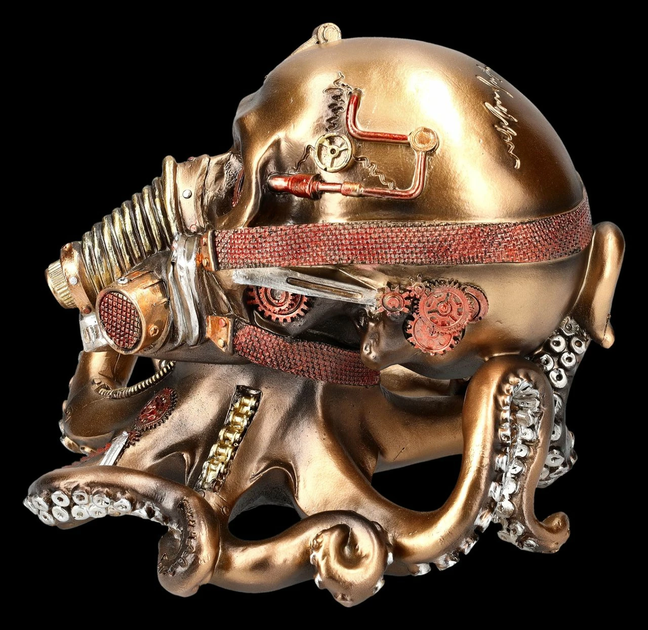 Die Krake mit der Gasmaske ist eine absolut faszinierende Deko für alle Technik- und Steampunk-Fans. Zahnräder, Schrauben, Muttern und vieles mehr lassen die Krake mit dem Totenschädel aussehen, als wäre sie magnetisch durch eine Werkstatt gerauscht. Der 15 cm hohe, 16 cm breite und 18 cm tiefe Steampunk-Totenkopf mit den Krakententakeln wurde detailreich aus handbemaltem Kunststein (Polyresin) gefertigt und ist damit auch ein durchaus fantasievolles Geschenk.