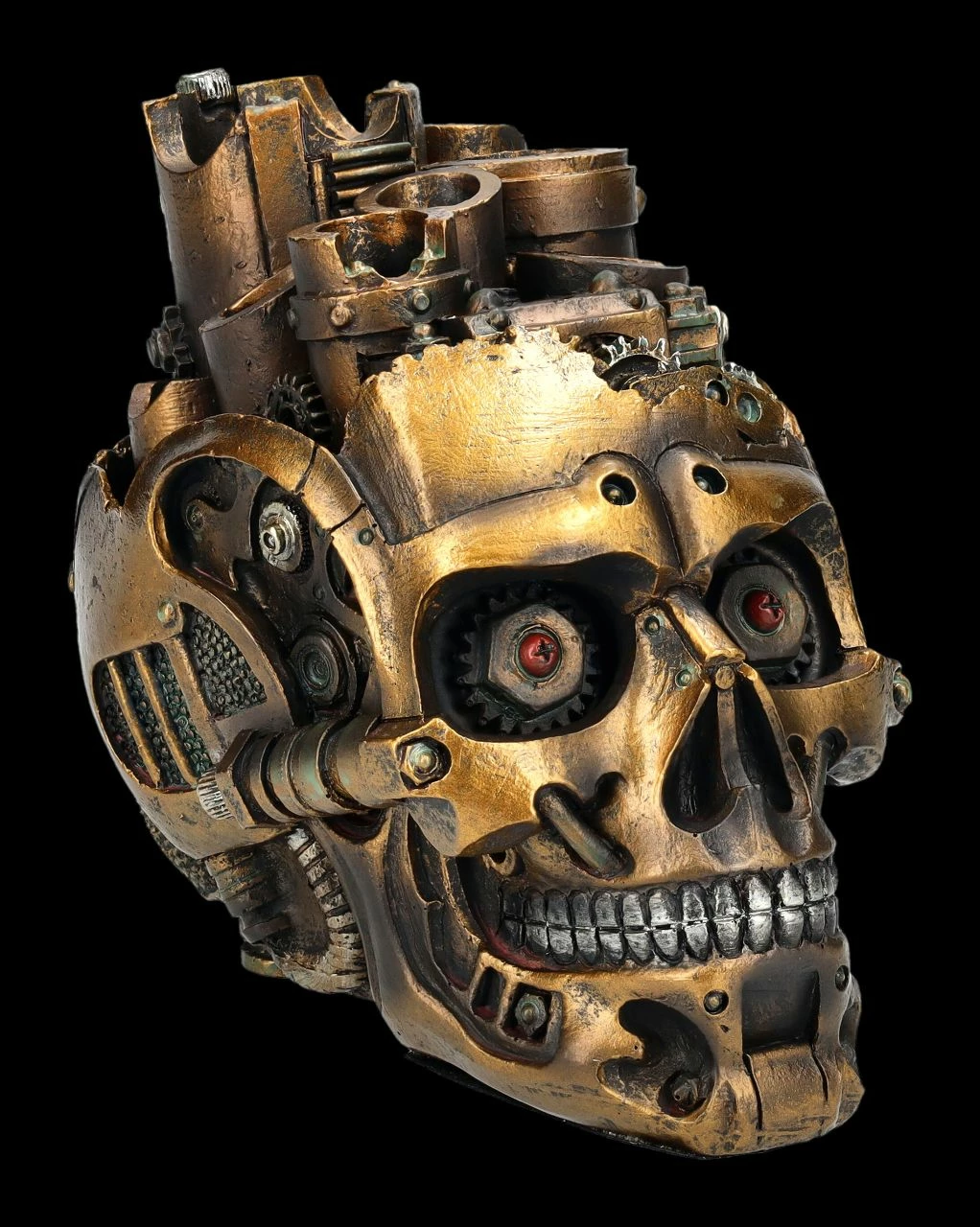 Dass sich in diesem coolen Totenschädel im Steampunk Stil eine Schatulle befindet, sieht man nicht auf den ersten Blick. An den Rädern kann man leider zwar nicht drehen, aber die zahlreichen Details des Gear Skull faszinieren dennoch. Der 13 cm hohe, 10 cm breite und 16 cm tiefe Schädel aus sorgfältig handbemaltem Kunststein (Polyresin) verfügt innen mit den Maßen H 5 cm x B 6 cm x T 10 cm nicht nur über ein perfektes Versteck, er kann auch auf dem Schreibtisch Stifte oder andere Utensilien aufnehmen. Sehr vielseitig – dieser faszinierende Totenschädel. Die Lieferung erfolgt ohne die Dekoration.