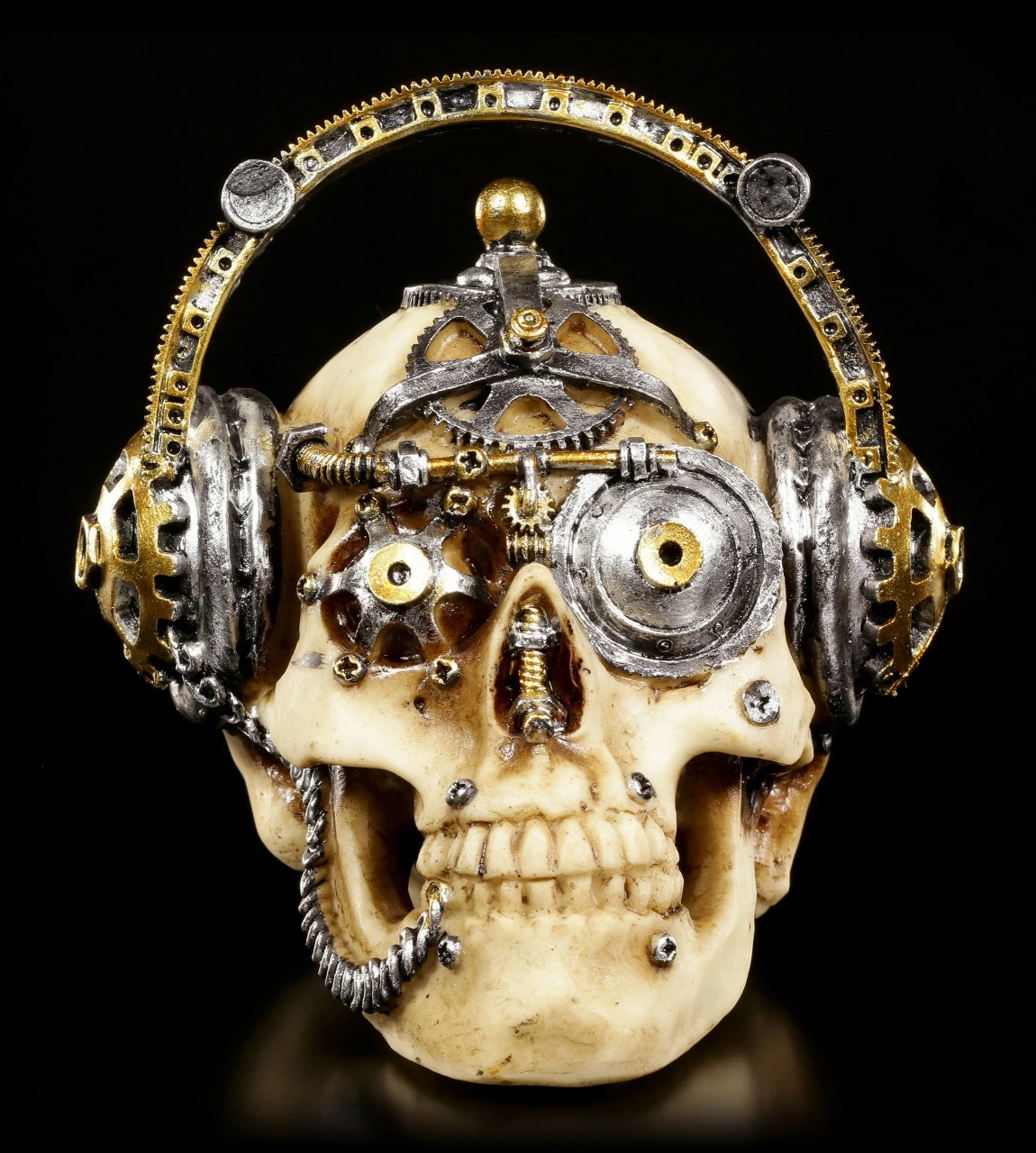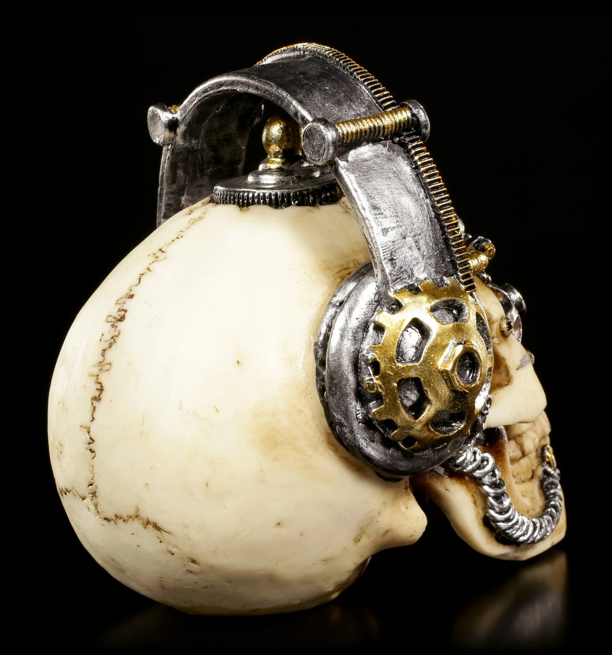 Der Steampunk Totenkopf Techno Talk ist für jeden Musikliebhaber genau das richtige Geschenk. Der Ausgefallene Schädel ist mit Zahnrädern, Schrauben und Gewinden versehen und selbst seine Kopfhörer sind außergewöhnlich gestaltet.