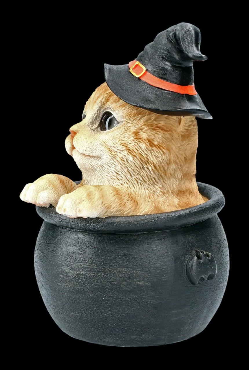 Sucht mich denn keiner, scheint sich dieses süße rote Tigerkatzenbaby zu fragen. Da war das Versteck im Hexenkessel wohl doch zu gut, oder macht mich vielleicht mein Hexenhut unsichtbar? Diese kleine süße Tabby Hexen-Katze ist mit dem Kessel 16,0 cm hoch, 11,0 cm breit und 10,0 cm tief und aus handbemaltem Kunststein (Polyresin). Das zauberhafte Kätzchen ist nicht nur zu Halloween ein tolles Geschenk für Katzenfreunde.
