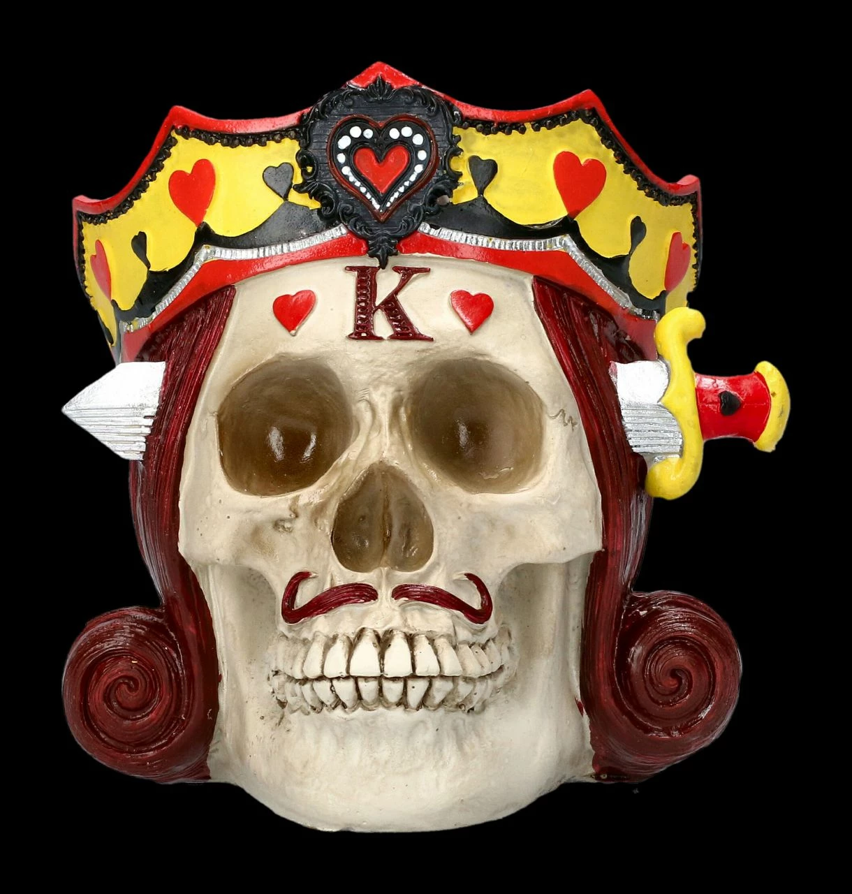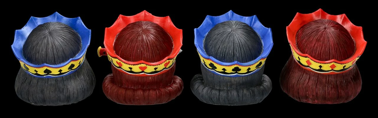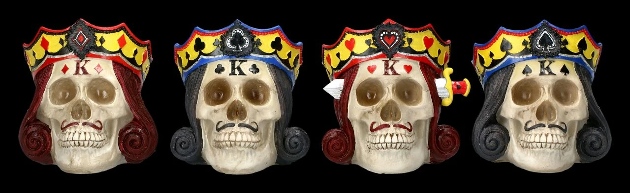 Vier freche Totenköpfe als Deko für Ihren nächsten Pokerabend – wie cool ist das denn! Das geniale 4-er Set ist aus lustig handbemaltem Kunststein (Polyresin) gefertigt. Die witzigen Poker Könige mit ihren Kronen sind je 12 cm hoch, 9,5 cm breit und je 11 cm tief. Um welchen König es sich handelt, ist ihm jeweils auf die Stirm geschrieben und auch auf der Krone zu entdecken. Besonders lustig ist vor allem der Herzkönig, dem auch noch ein Messer im Kopf steckt. Wäre doch interessant, wenn die vier Könige Ihre Pokerfreunde so verwirren, dass Sie jede Runde gewinnen.