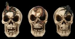 Hier sind nicht nur die Totenschädel ziemlich unheimlich, mit den gruseligen Krabblern, die offenbar die Schädel als Heim ausgesucht haben, kann man sicherlich jeden erschrecken. Spinne, Skorpion und Tausendfüßler auf den Schädeln wirken außerordentlich realistisch. Das detailreiche 3er Set aus handbemaltem Kunststein (Polyresin) mit den 9 – 10 cm hohen, je 6 cm breiten und je 10 cm tiefen und von den Krabblern besetzten Totenköpfen sind nicht nur tolle Sammlerstücke, sie werden selbst an Halloween oder bei einer Horrorparty für Gruseln sorgen.