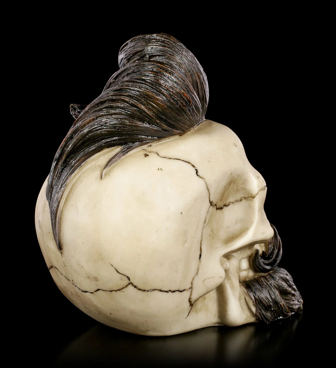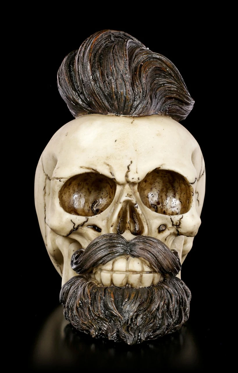 Der Totenschädel ist schon blank, nur sein Bart und seine Haartolle sind noch vorhanden. Der umwerfende handbemalte Schädel Bearded Buddy aus Kunststein (Polyresin) ist besonders auffällig und passt auch in einen trendigen Friseursalon.
